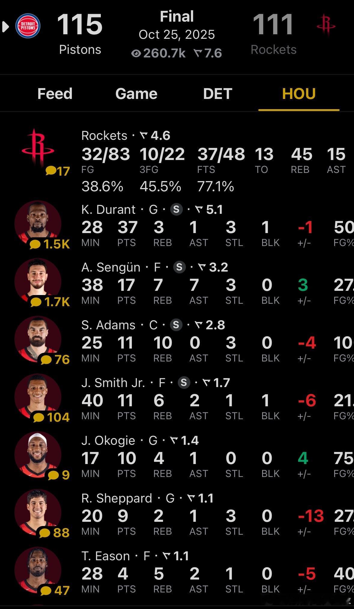 杜兰特18投9中拿下37分3篮板3抢断1助攻1盖帽;奥科吉4投3中拿下10分4篮板;亚当斯11分10篮板,小贾11分6篮板。
