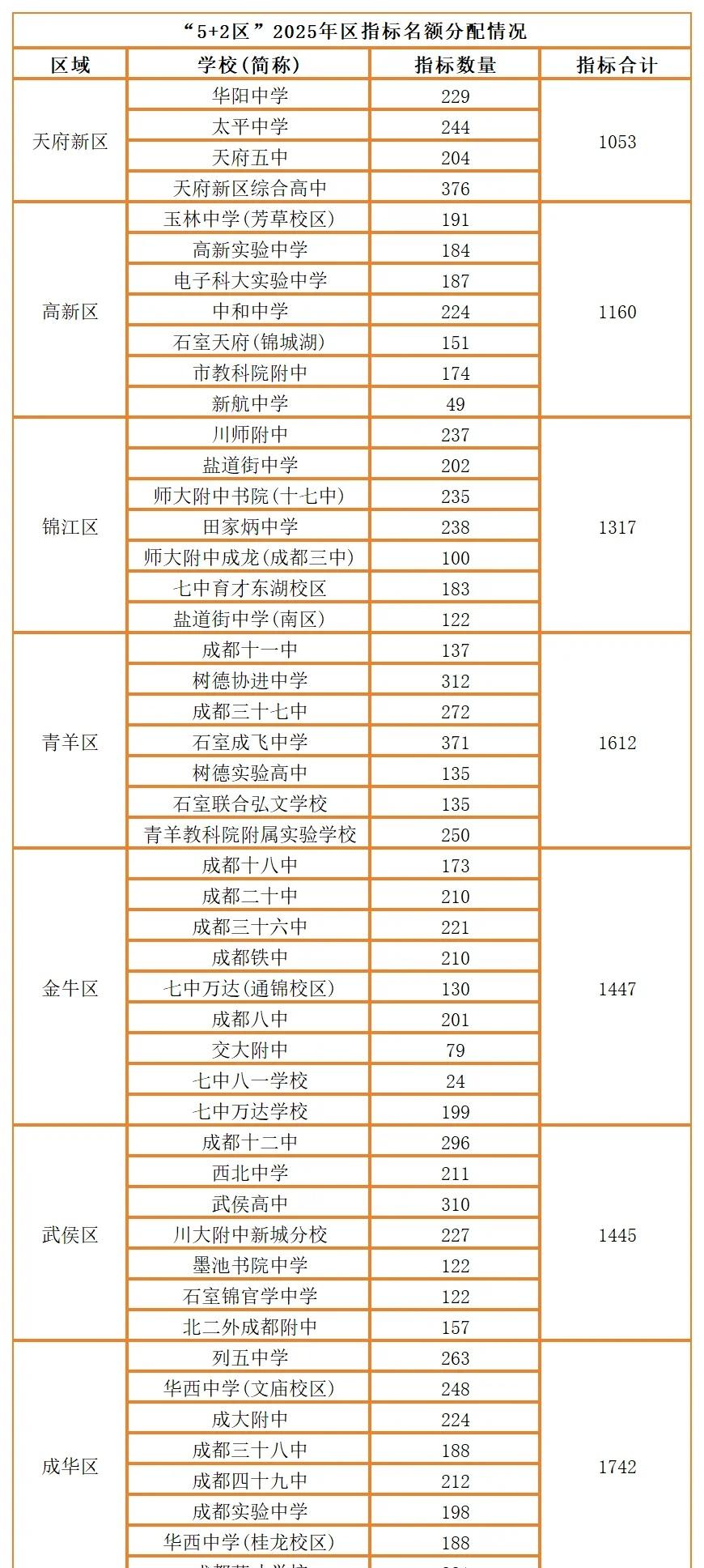 成都 “5+2 区”25 年区指标名额分配来啦! 2025 年成都 “5+2 区” 的区指标名额分配情况,快看看你家娃目标学校的指标数有多少~ 天府新区:合计 1053 个指标,其中天府新区综合高中以 376 个指标位居该区榜首,太平中学也有 244 个指标,想在天府新区升学的家长可以重点关注这几所学校哦~ 高新区:总计 1160 个指标,电子科大实验中学、中和中学等校指标数都很可观,玉林中学(芳草校区)有 191 个指标,高新区的家长可以好好研究下这些学校的指标分布~ 锦江区:指标合计 1317 个,川师附中 237 个、田家炳中学 238 个,还有师大附中书院(十七中)235 个,锦江的优质教育资源很丰富,家长们可以多对比~ 青羊区:以 1612 个指标成为 “5+2 区” 指标数最多的区域!石室成飞中学 371 个、树德协进中学 312 个、成都三十七中 272 个…… 青羊区的家长们选择面很广哦~ 金牛区:合计 1447 个指标,树德协进中学 312 个(哦不对,树德协进在青羊区,金牛区里成都铁中、成都三十六中、成都二十中等校指标数都在 200+,还有七中万达(通锦校区)130 个指标,家长们可以针对性关注~ 武侯区:指标合计 1445 个,成都十二中 296 个、武侯高中 310 个,川大附中新城分校 227 个,武侯区的这些学校实力也不容小觑~ 成华区:以 1742 个指标紧随青羊区之后!列五中学 263 个、华西中学(文庙校区)248 个、成都四十九中 212 个…… 成都初升高 成都教育 成都中考 指标到校 初三