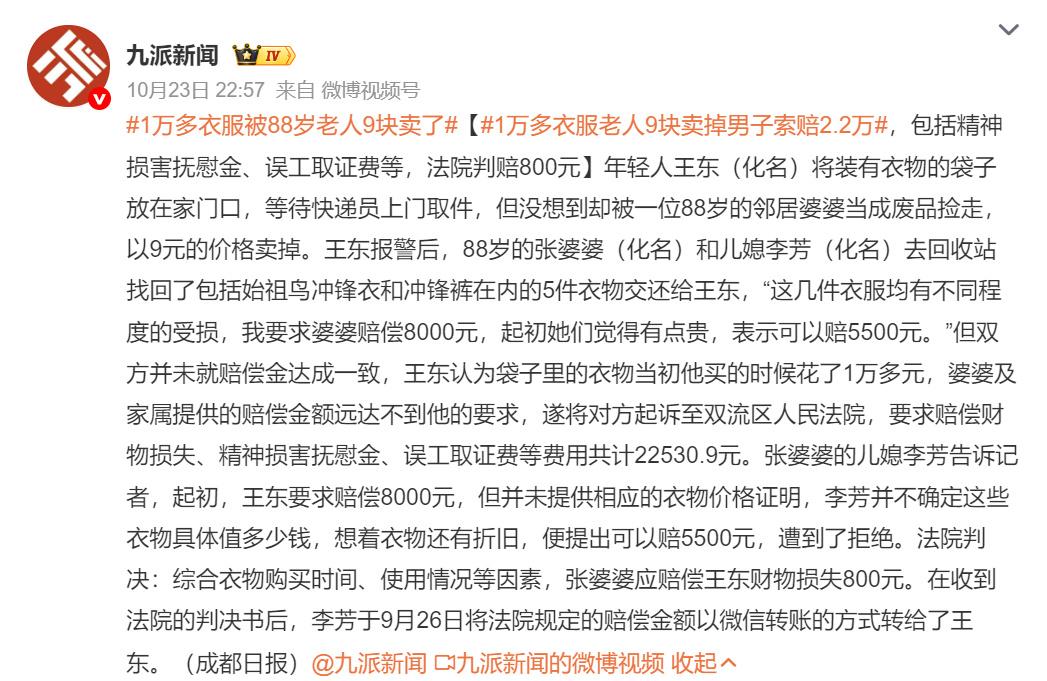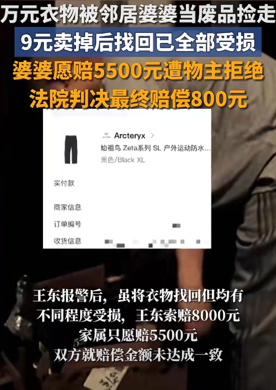 笑不活[笑哭]!1万多的衣服被88岁奶奶9块卖掉,法院判决更有意思! 谁能想到啊!把1万多的新衣服放门口等快递,转头就被88岁邻居奶奶当废品收走,9块钱就卖给回收站了!😂 成都这位大哥别提多憋屈了,里面还有全新带吊牌的冲锋衣,找回来时都被折腾得不成样子。大哥气不过起诉要赔2.2万,结果奶奶家先主动说赔5500,最后法院判了800块收尾。 其实这事儿真没啥赢家,奶奶年纪大了分不清废品和贵重物品,大哥的新衣服遭了殃,说到底都是邻里间的小插曲。现在的银发族可太有“行动力”了,有的爬树健身有的玩转新媒体,但偶尔也会因为认知差闹这种乌龙事儿。 在这里给大家提个醒,贵重物品千万别随便放门口了,遇到老人误拿太气人啦~ 你身边有没有同款“热心又迷糊”的长辈?要是你遇到这事儿,会接受5500还是等法院判决?来评论区聊聊! 银发族的可爱瞬间 邻里相处那些事 生活里的小乌龙