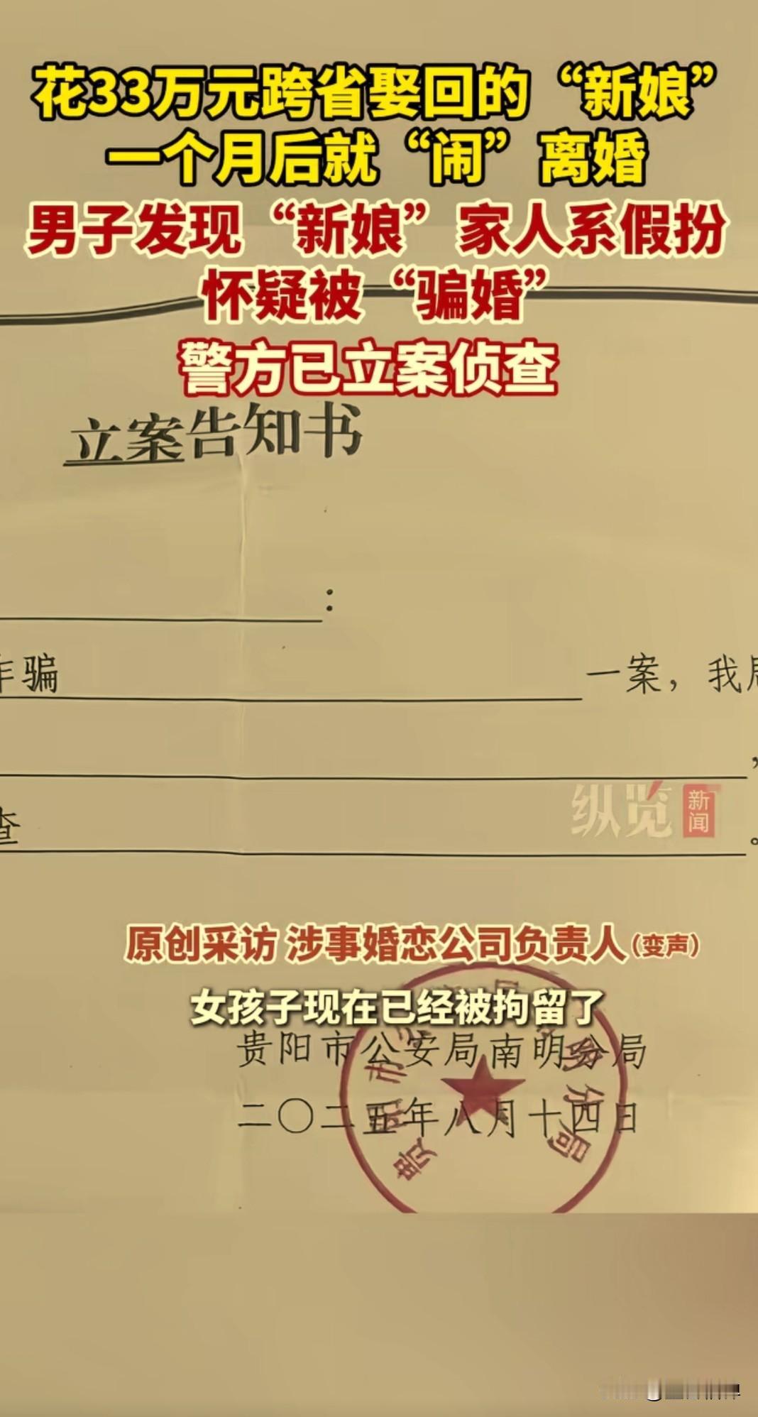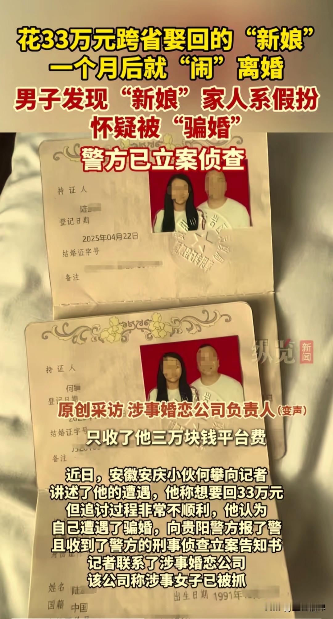 安徽安庆太湖县29岁男子何先生,因单身想找个老婆结婚,在贵州一婚恋公司介绍认识了一名女子,相识两天就领证,结果女子4天就跑了,被骗损失约33万元。 何先生说他在温州一家鞋厂上班,虽然辛苦点,但是每个月也有一万块钱收入,就是一直没有女朋友,刷视频软件的时候看到老家一个镇有红娘介绍对象,他联系了一下,对方说有20万就够了。 他想着先不买房了,正好手里有几十万,先成个家娶个老婆,就和红娘一起去了贵州花果园相亲,当天就相了一个女的,比较看好。 没想到的是那女的父母都是演员,不是真正的父母,姑姑也是别人假扮的,女子也隐瞒了吸毒史和有过几次离婚的事情,并且家里还有一个小孩。 女子和何先生领证后去了他家,没想到住了4天就跑了,一个月后女子提出离婚,双方仅就同房过一次。 目前贵州警方以涉嫌诈骗罪立案侦查,女子陆某已被刑事拘留,婚恋公司及红娘退回了收取的平台费和介绍费等费用,婚恋公司已经关门,给女方的钱还未追回。 何先生发视频说事情已经发生了,也不怕发出视频丢人坏了名声什么的,只是想告诉大家,他是上当受骗了,不是他自己的原因对方过不下去导致这样的结果,希望让更多人看到,不想大家上当受骗。