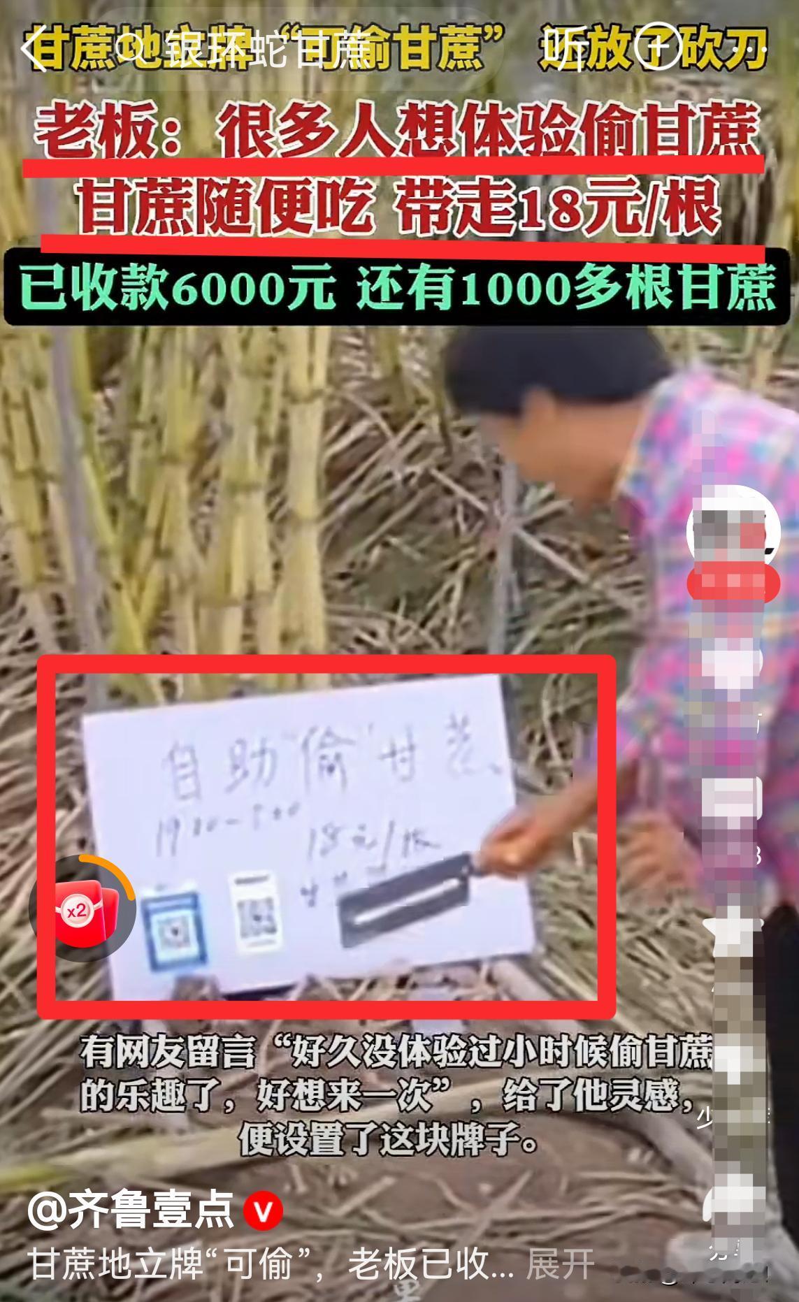 “偷”甘蔗,偷着乐!浙江绍兴一甘蔗地老板立牌“自助‘偷’甘蔗,18元/根……”还附带收款码和甘蔗刀。 这个“偷”字是神来之笔啊!通过这反向操作,抓住人们“偷”心理,反向销售,更具趣味性和实用性。可以想象一下,“偷”甘蔗的人,猫着腰,眼睛左瞟右看,越过公路,穿过田埂,深入甘蔗林,看“中”某根。手扶甘蔗,一刀下去,甘蔗到手。 再去皮,咬一口,满嘴甜汁啊……“偷”着就是乐!哈哈 当然,这个“偷”,还少不了主人和“偷”蔗人尊重和信任,这样才能到达应有的高度![赞][赞]