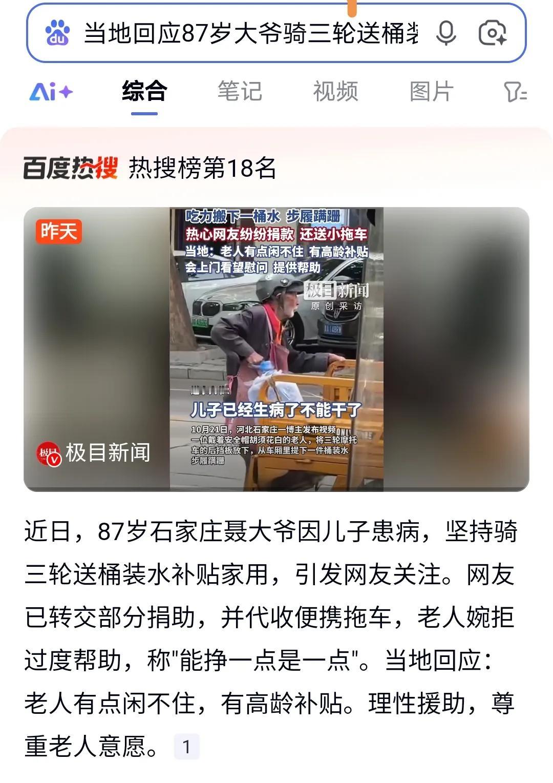 家人们,今天看到个事儿,真的让人心里五味杂陈。 河北石家庄有个87岁的聂大爷,居然还骑着三轮送桶装水呢!这视频一出来,转评赞都7万多了。原来啊,本来是他儿子送水,结果儿子生病干不了了,聂大爷就扛起了这担子,说一天挣个十块八块能补贴家用。 当地政府也回应啦,说老人有个二儿子有正式工作,所以不符合低保条件,但有高龄补贴。还说会派人上门慰问,也会在政策范围内帮老人。 这事儿吧,老人确实让人佩服,这么大年纪还为家庭奔波。但咱也得说,政府的政策是不是可以更灵活点呢?像这种特殊情况,能不能有更多的帮扶?还有啊,大家献爱心是好事,但也得注意别打扰到老人生活。希望以后类似的事能处理得更周全,让老人能真正安享晚年,别这么辛苦啦。