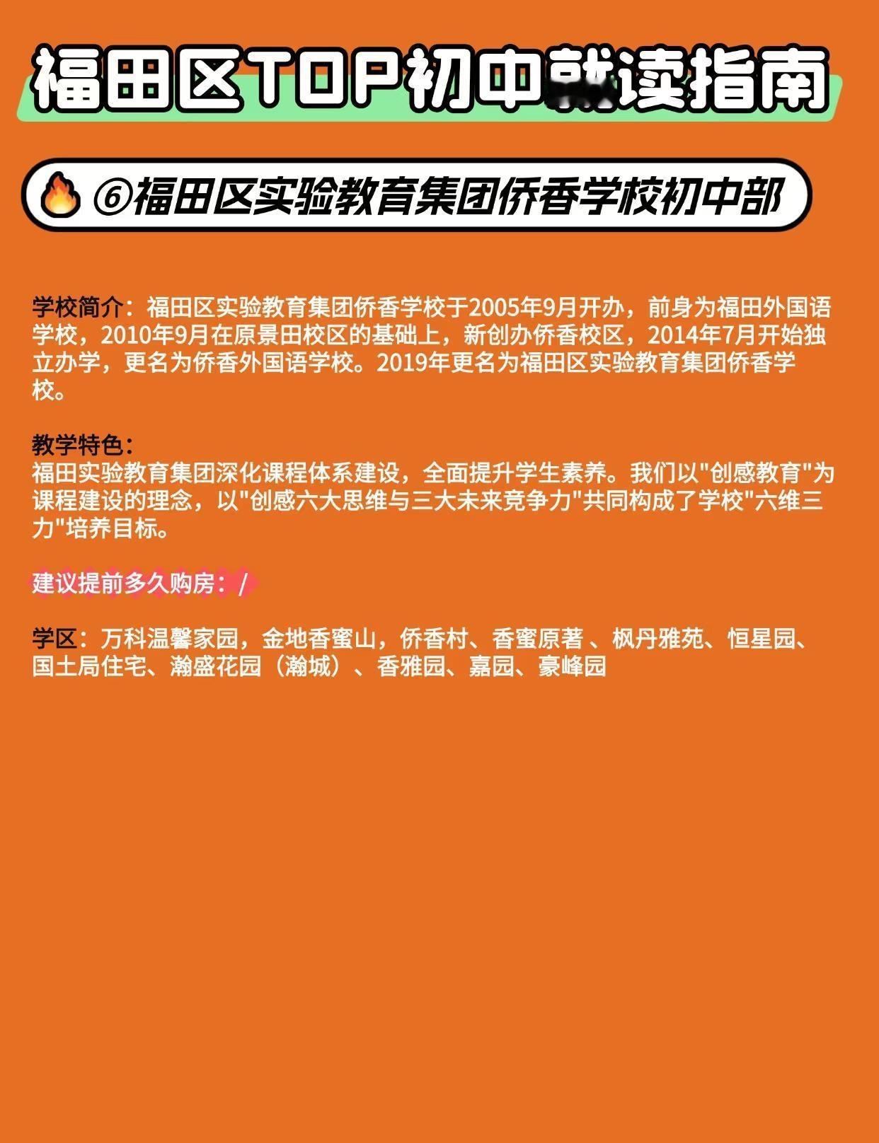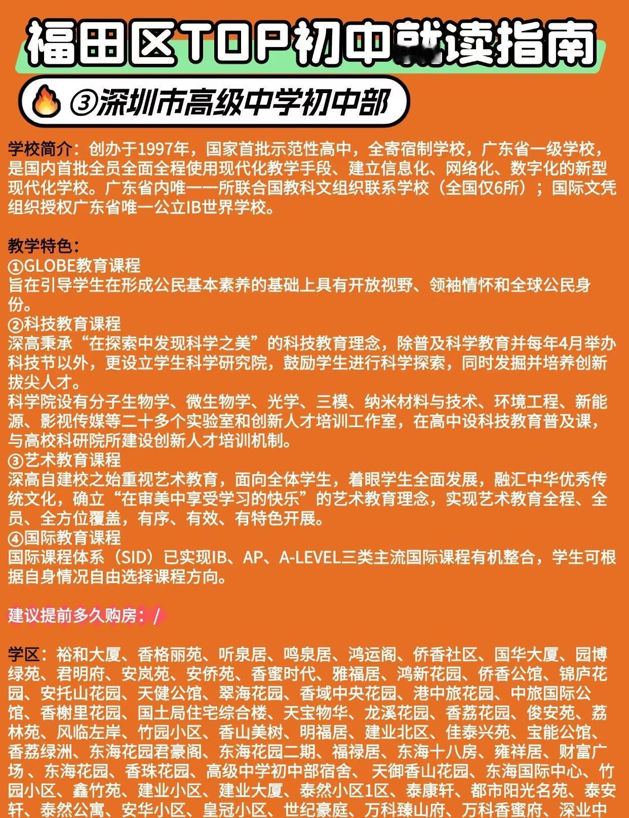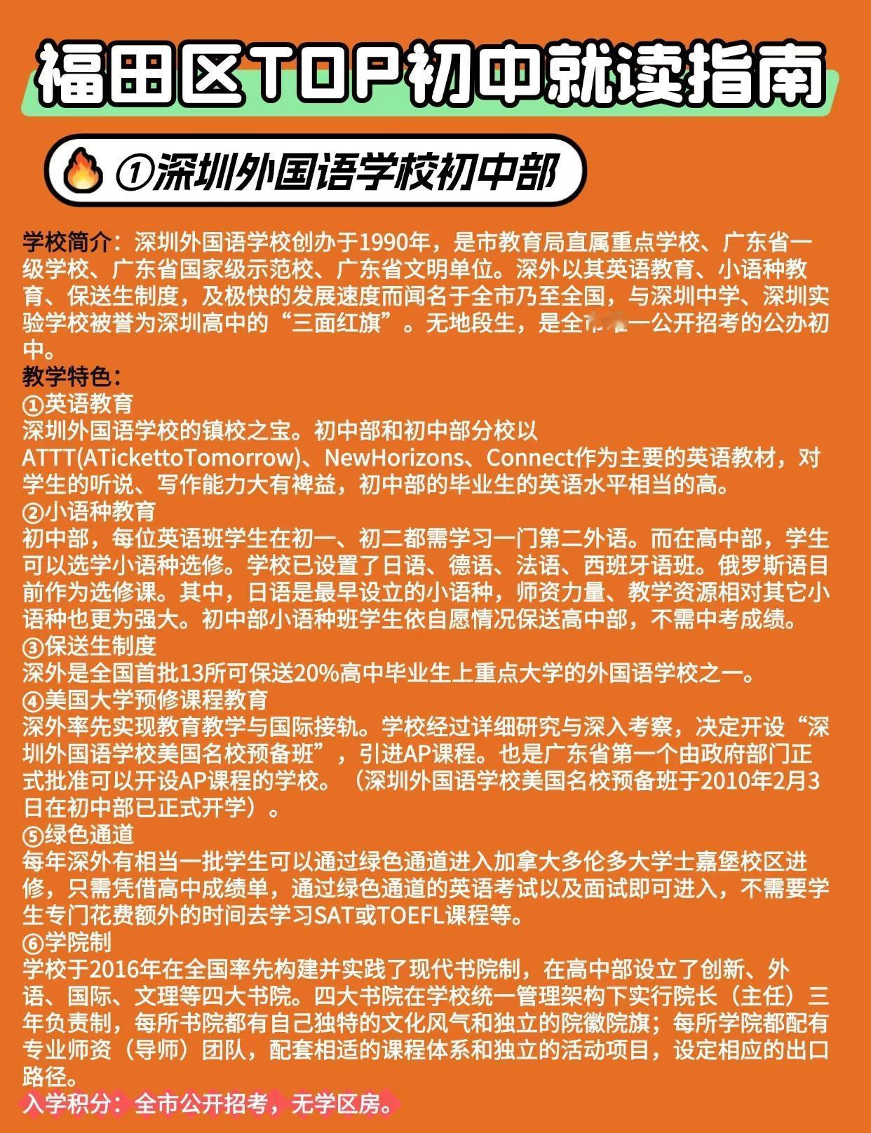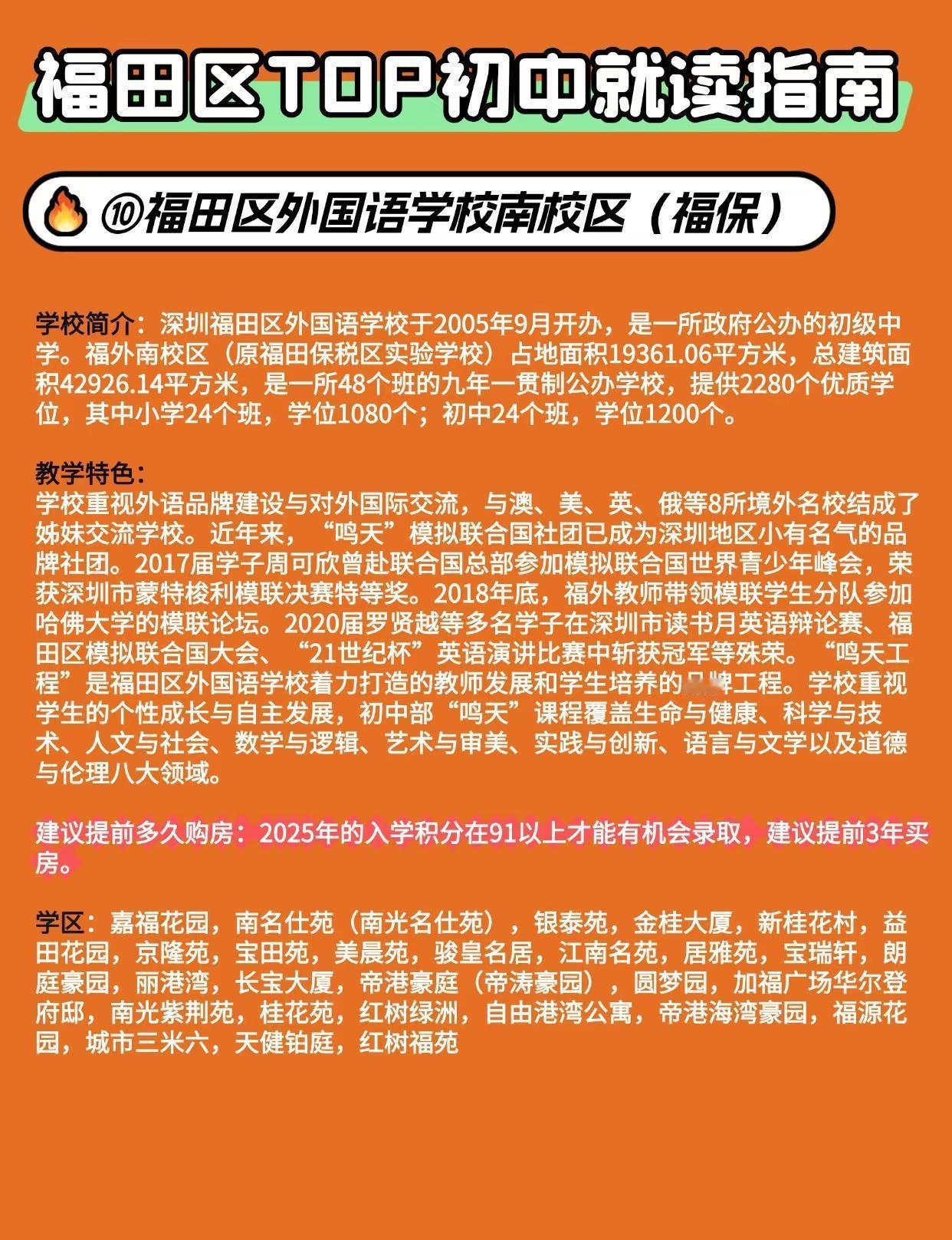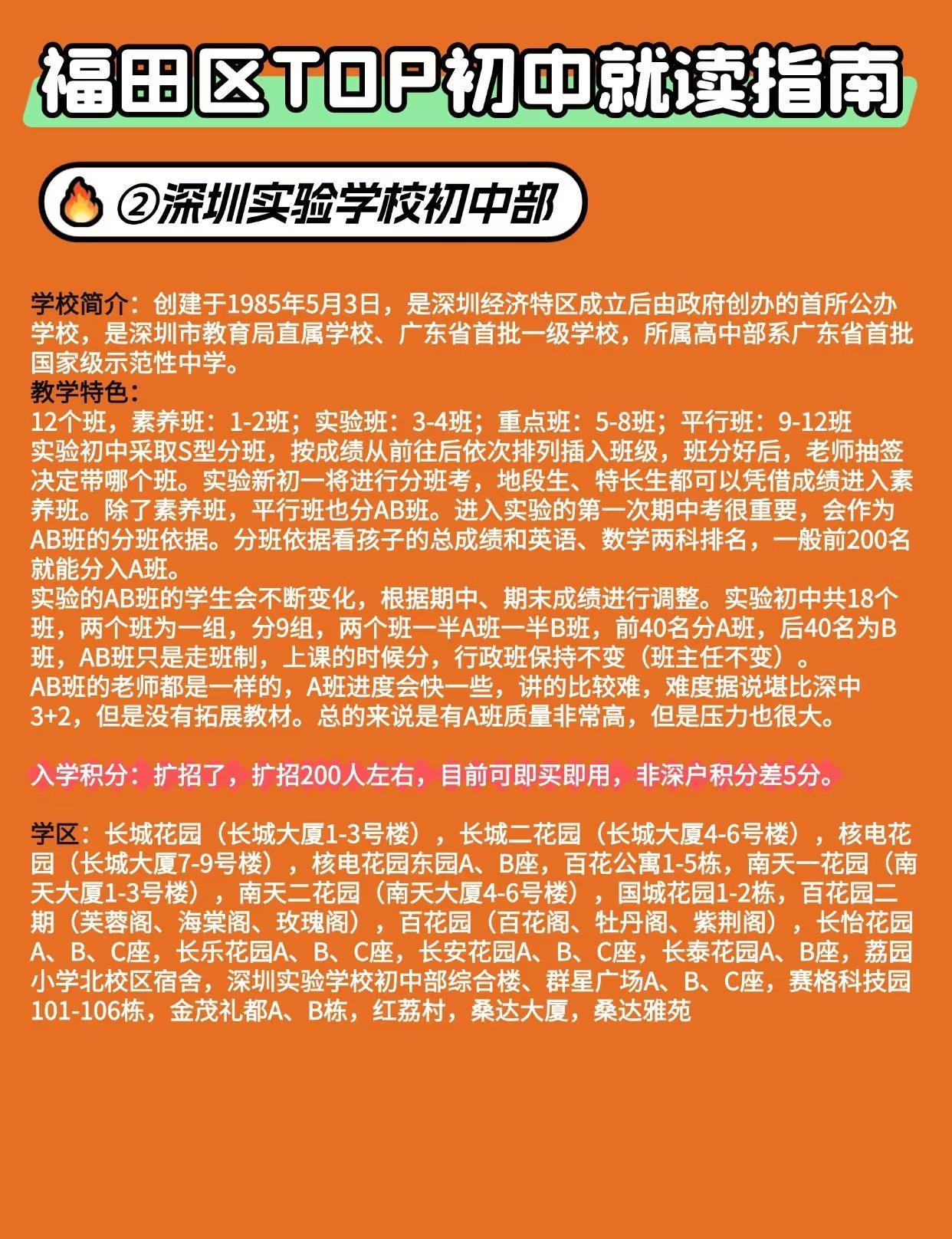 福田区TOP 10初中就读指南来了! 福田区TOP初中就读指南: ①深圳外国语学校初中部——买房建议:全市公开招考,无学区房。 ②深圳实验学校初中部——建议提前多久购房:扩招了,扩招200人左右,目前可即买即用,非深户积分差5分。 ③深圳