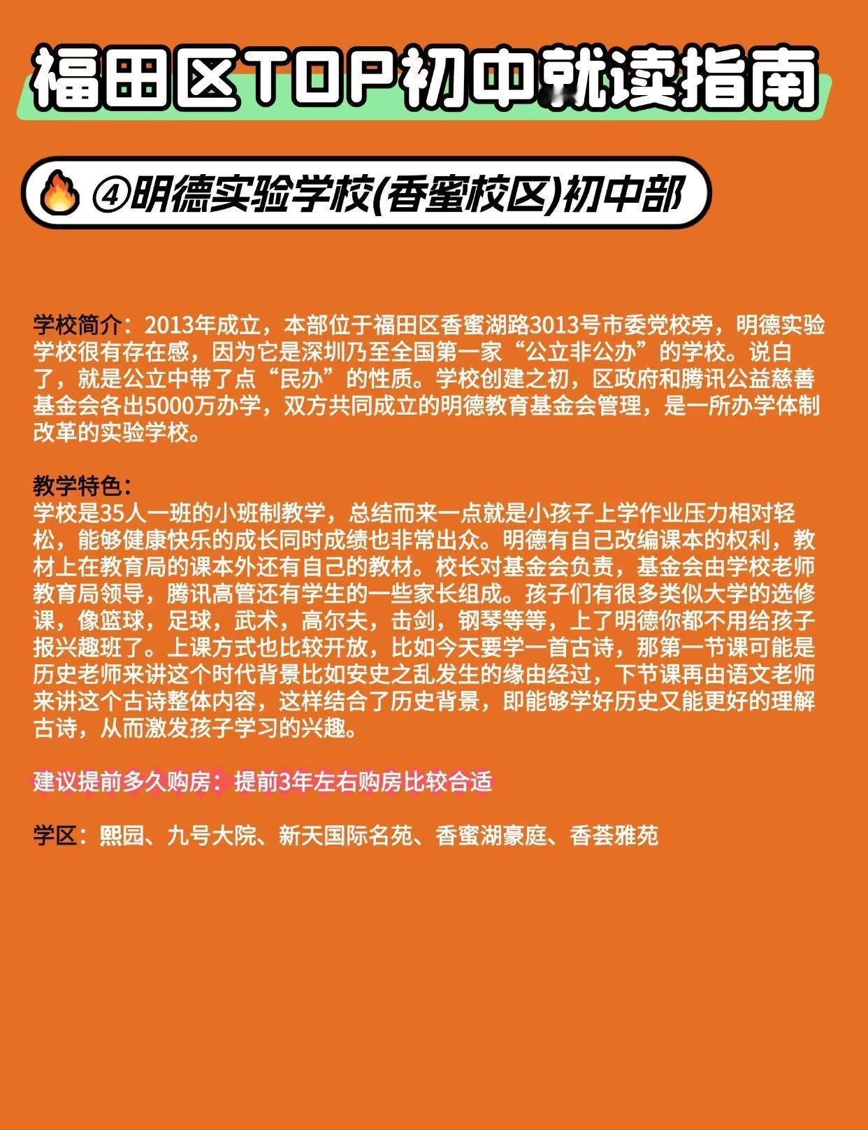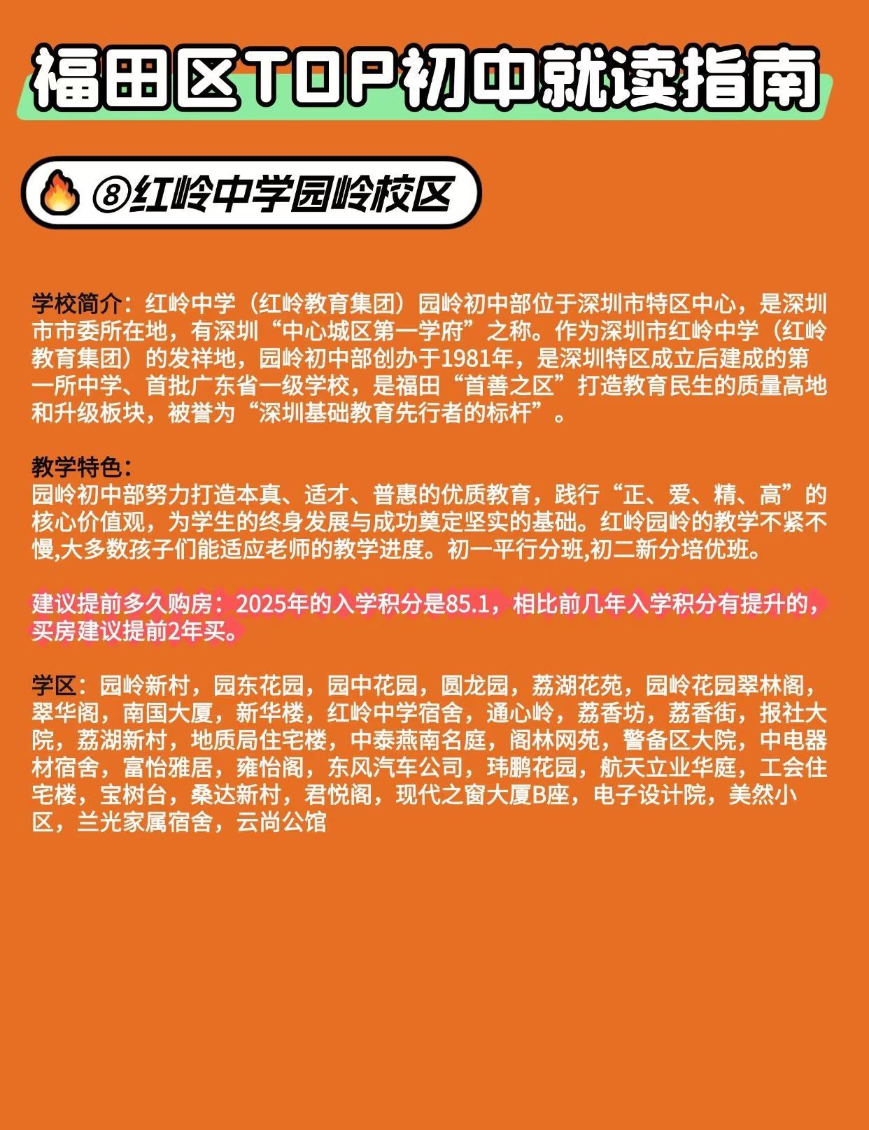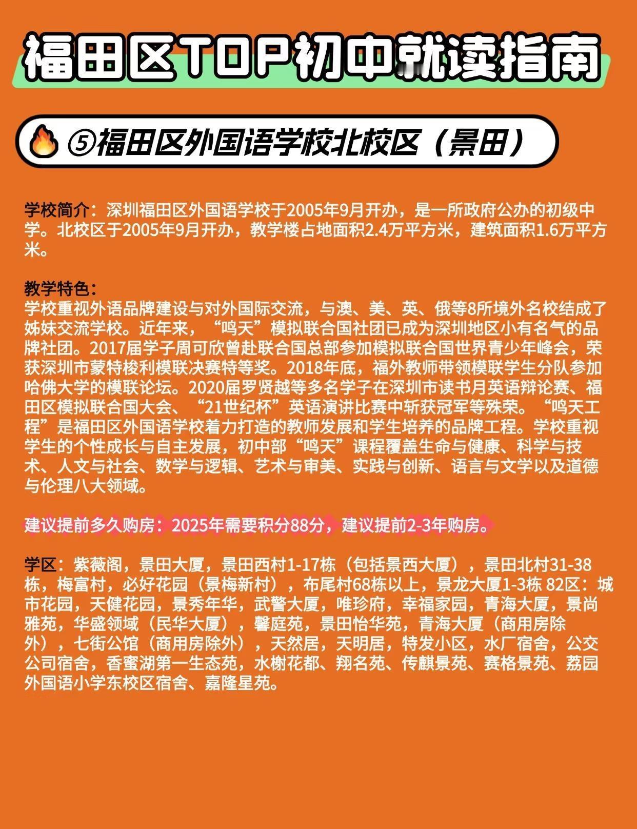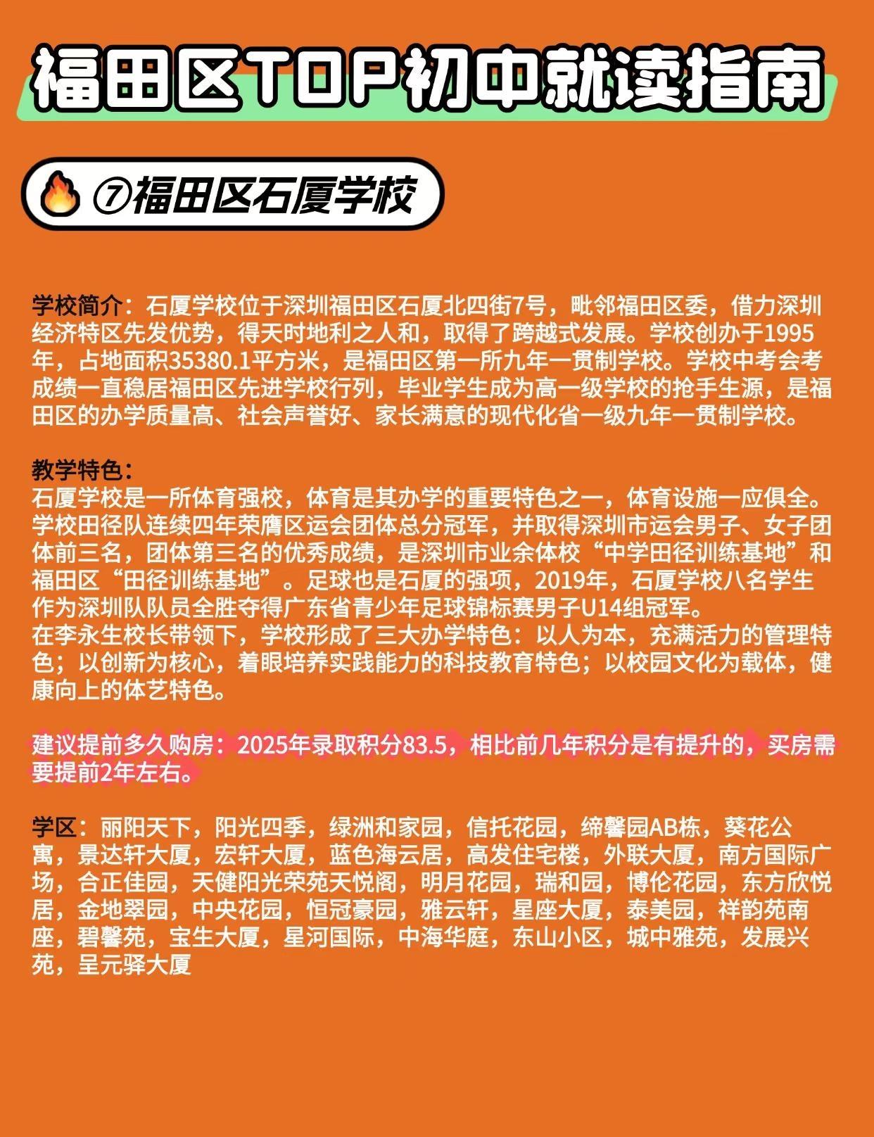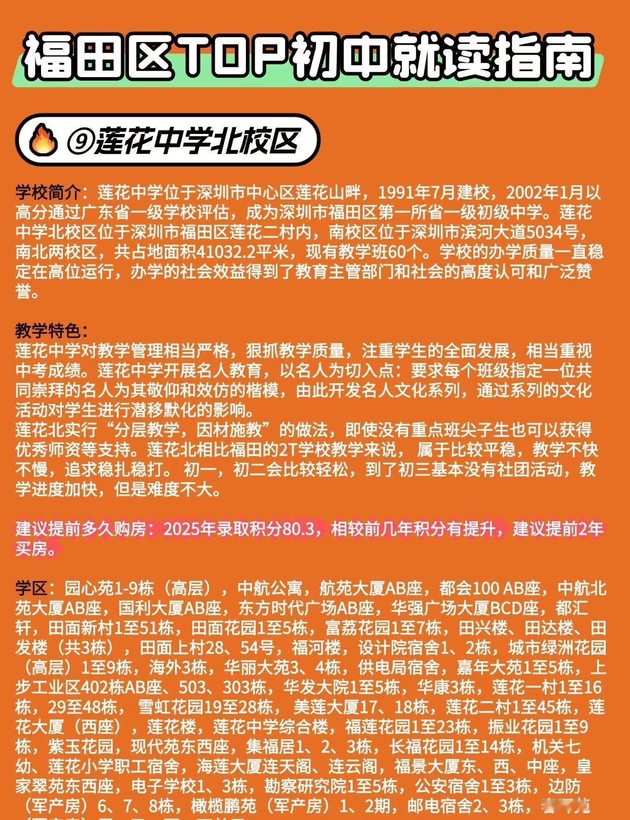 福田区TOP 10初中就读指南来了! 福田区TOP初中就读指南: ①深圳外国语学校初中部——买房建议:全市公开招考,无学区房。 ②深圳实验学校初中部——建议提前多久购房:扩招了,扩招200人左右,目前可即买即用,非深户积分差5分。 ③深圳