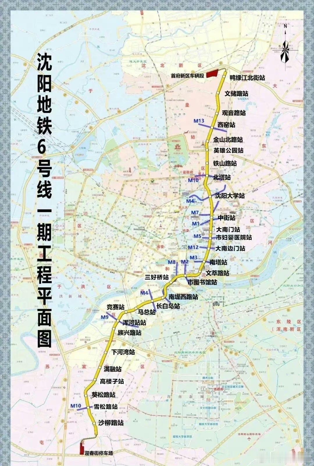 沈阳地铁6号线2026年通车 沈阳地铁6号线一期工程计划于2026年底开通试运营‌,想想就超期待!该线路北起鸭绿江北街站,南至沙柳路站(或迎春街站),全长34.51-36公里,设29座地下车站,全部为地下线敷设‌。设14座换乘站,可与1、2、4、9、10号线及规划线路实现换乘‌,以后出行可太方便了。 截至2025年8月,29座车站中已有20座封顶并进入装修阶段,剩余9座处于土建施工。60个轨行区间中29个已贯通,26个正进行铺轨及机电施工。部分高风险区间(如族兴路站-下河湾站、马总站-长白岛站)已实现双线贯通‌。 之前2024年12月时,车站和区间进度还没这么快,这建设速度真是杠杠的,坐等通车! 六号线通车 六号线地铁盘