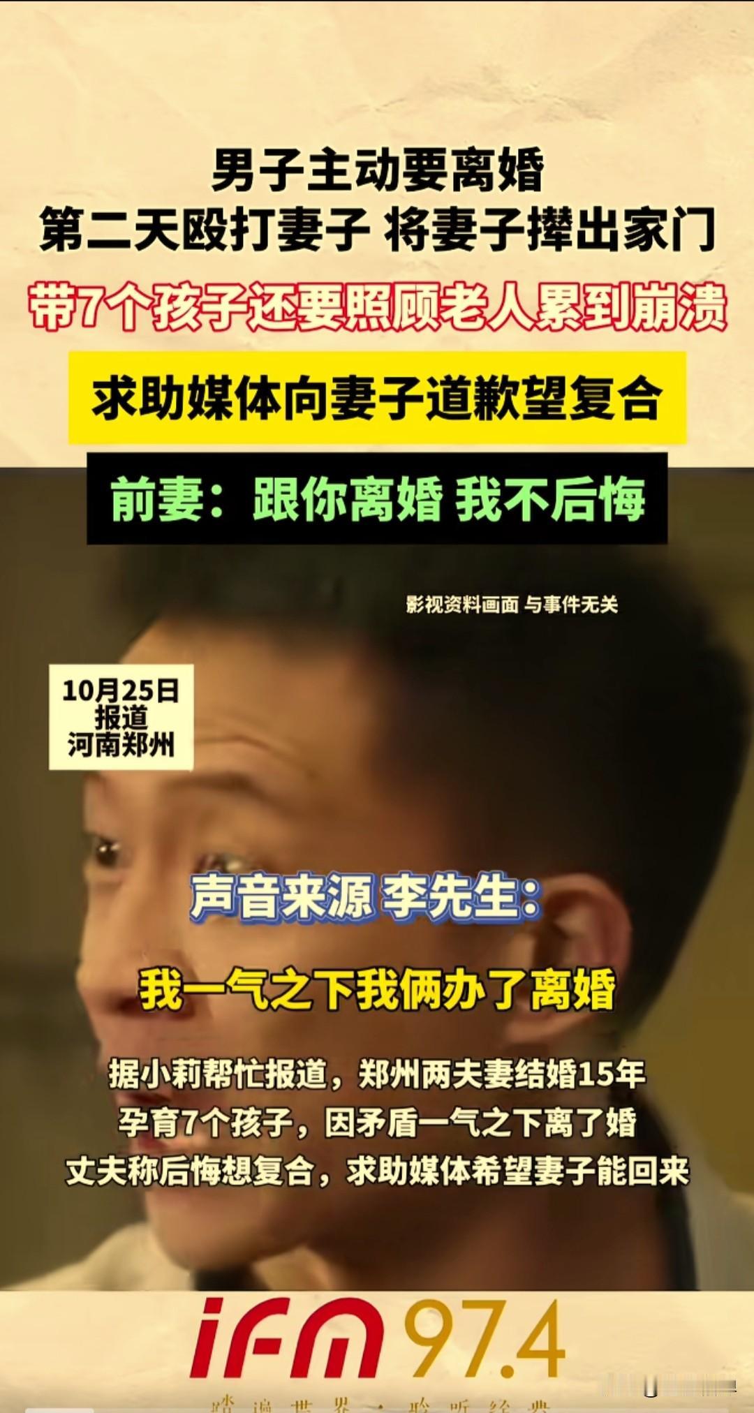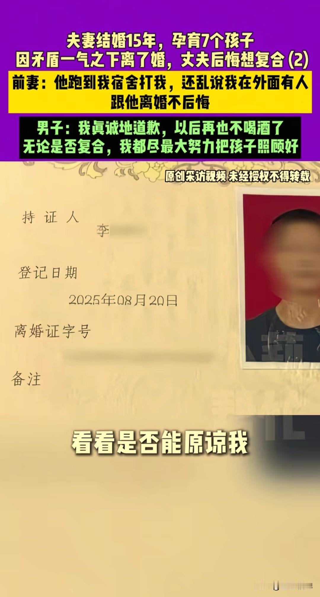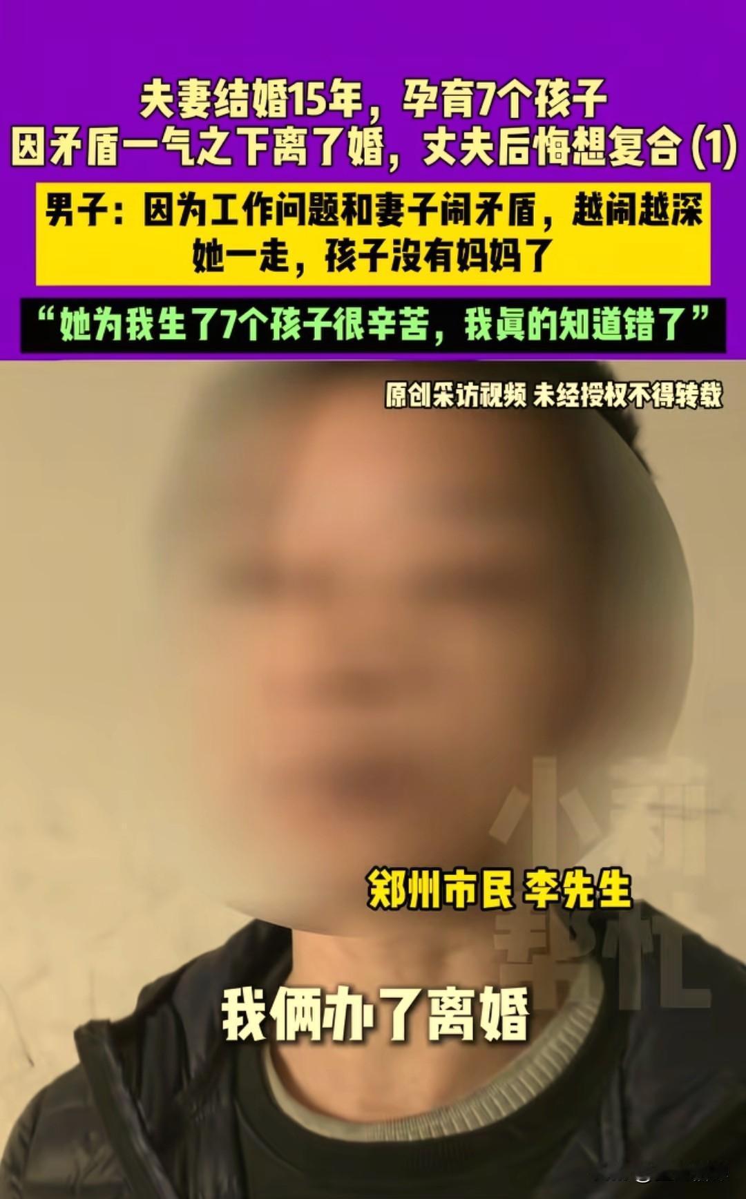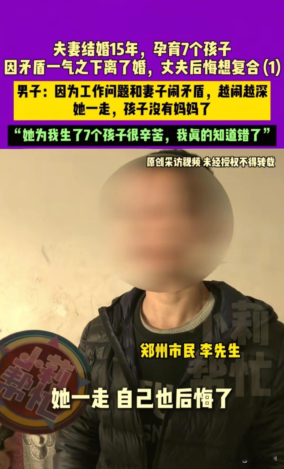 夫妻结婚15年,生育7个孩子,因矛盾琐事男子一气之下主动提出了离婚。 现在一个人要带着7个孩子,父母身体不好也需要照顾,累到奔溃说很后悔想找前妻复合,前妻说你后悔,跟你离婚我可不后悔。 河南郑州的李先生和妻子结婚15年,感情也很好,还有七个可爱的孩子,今年6月份办理了离婚,现在很后悔,求助媒体小莉帮忙希望妻子能回来。 李先生说他们本来有两个儿子两个闺女,想再要一个儿子,结果连生了三胎都是女孩,现在一共有七个孩子,也不敢再要了。 他说事情起因是他和朋友开了一个饭店,他就让妻子辞掉工作和他一起经营饭店,妻子不太愿意。 后面两人经常吵架,饭店后面经营不善倒闭了,两人还在闹,他就一气之下提出了离婚。 妻子走了之后他也后悔了,一回家见不到人,孩子没有妈妈了,孩子哭着要找妈妈,父母年龄大了也需要人照顾,他心里很酸,知道自己真的错了。 妻子于女士接通电话,说她一点也不后悔,他的死活和自己无关,领了离婚证才刚两天,就撵她走,她搬宿舍的时候还找到宿舍把她打了一顿。 说她在外面有人了,和她同事搂搂抱抱的,她啥时候有人了。李先生给记者说他是当时喝酒了也说的是气话,他知道妻子在外面没人。 现在也意识到自己的错误了,他准备把酒戒了,也通过小莉帮忙这个节目给前妻真诚的道歉,希望能够原谅他,他也会自己努力把家和几个孩子照顾好。 来源:小莉帮忙