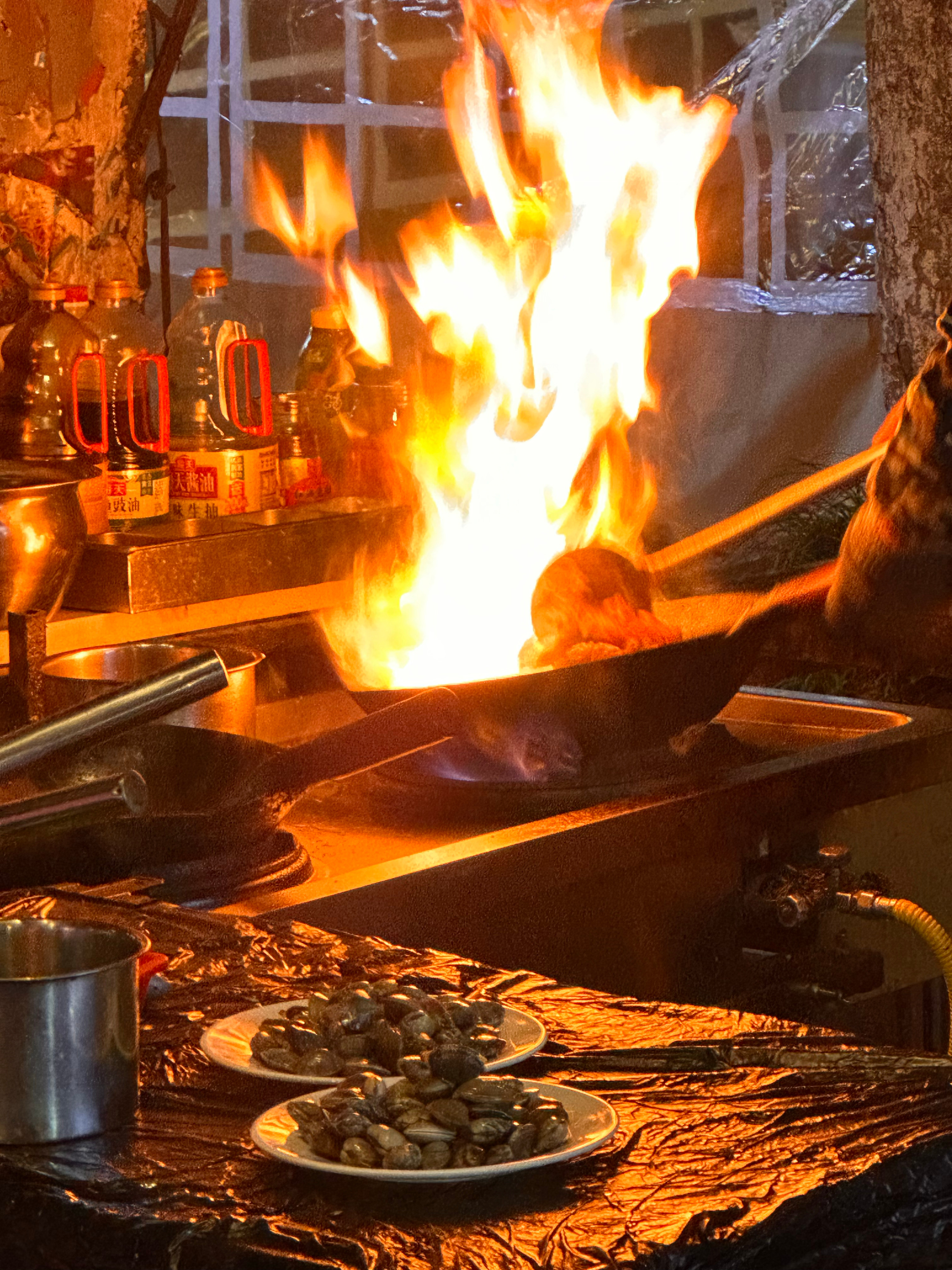 结束了仨人蹲在路边摊吃宵夜 大火嗷嗷烧
