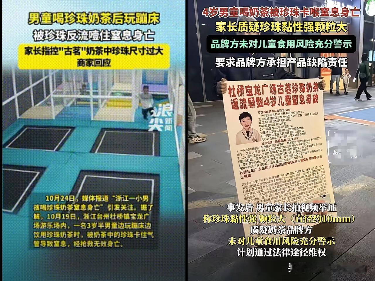 一杯奶茶,成为最后一滴眼泪!全家出动躺商场门口开…闹! 浙江台州发生一起悲剧,4岁男童在蹦床上玩时喝了口珍珠奶茶,随后猝死,家属质问奶茶店为何不提醒。实际上,小程序下单时已提示儿童需监护,大人未尽责,家长监护首要的责任人。 医生表示,珍珠容易堵塞气道,孩子吞咽功能较弱,在蹦床上玩耍时大口饮入,容易引发呛咳,造成窒息。 多地发生用海姆立克法救回卡喉者的案例,急救知识非常重要。而且安全不应只依赖商家提醒。家长应加强监护,乐园内的食物饮品应有所限制。对于急救知识人人必备。或许下一个被救回的人就是你的孩子。 对此,大家怎么看呢