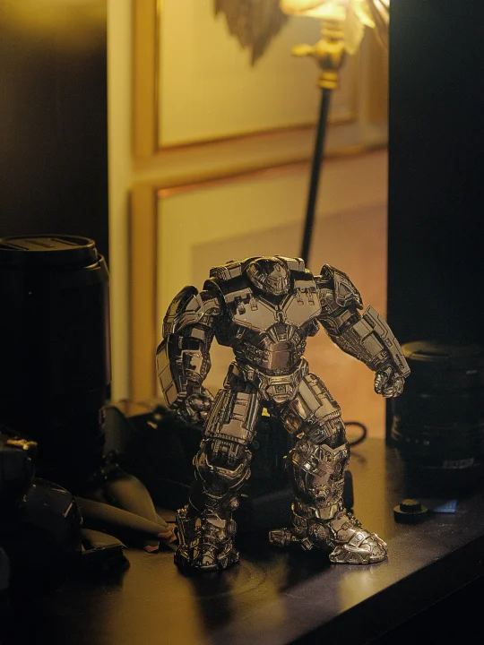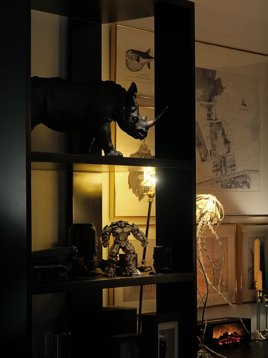 说到软装,我很喜欢用📚书架和开放柜来打造秩序感。柜子采用的是横平竖直的基础款,线条简洁,不要担心单调,只要把书和自己喜欢的藏品摆件往上一放,立马就丰富了,最近摆上了从京东家居馆入手的漫威系列反浩克装甲1.0的铜摆件,金属质感超酷,给空间添了份硬朗