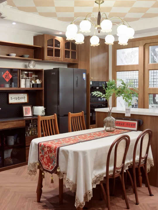 比如吧台、沙发、餐桌椅、厨房推拉门、吊顶的造型等我都保留了下来