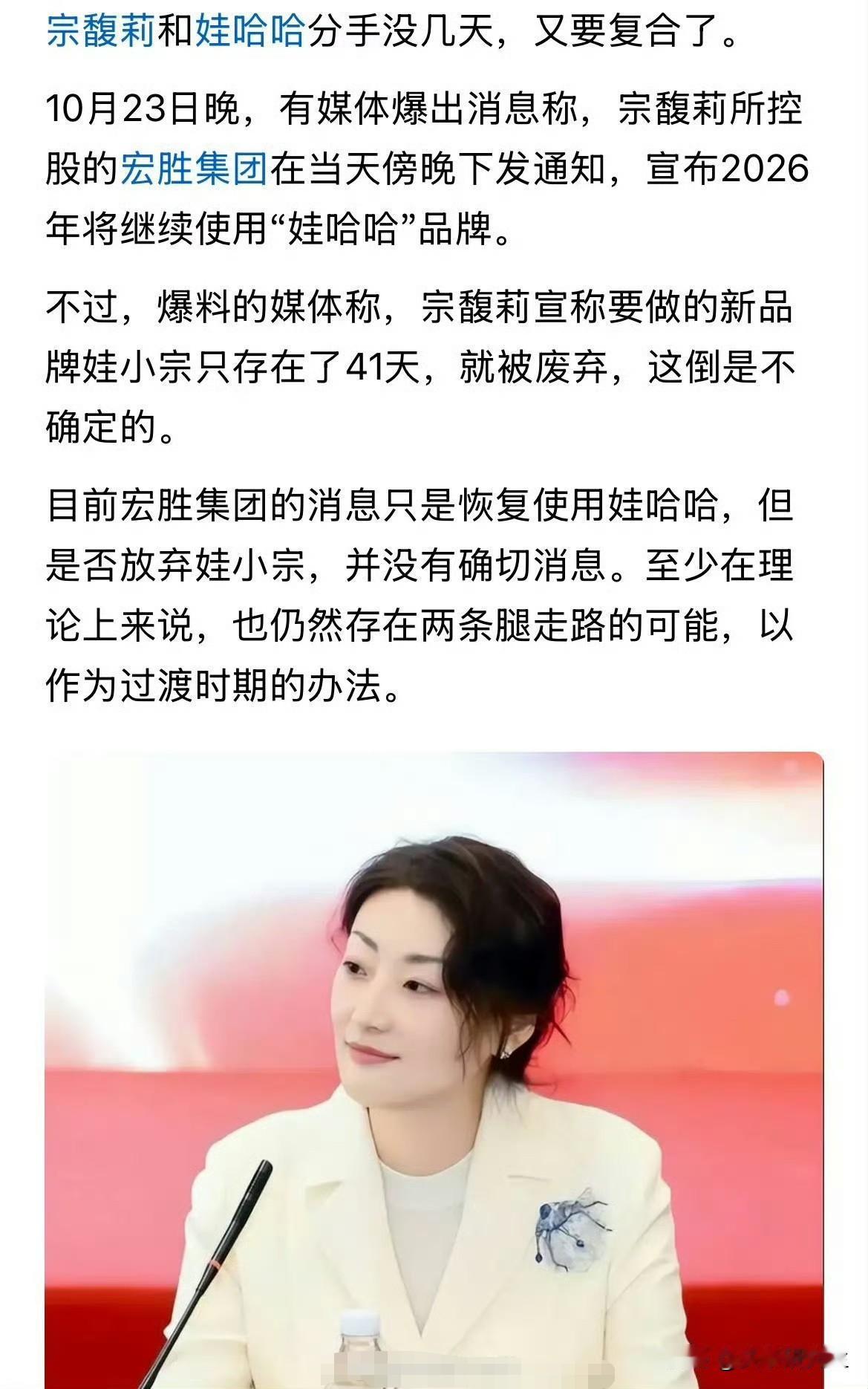 宗馥莉这下棋走对了! 不到两个月前,她刚辞去娃哈哈集团所有职务,转身推出自己的品牌“娃小宗”。很多人觉得她这次真要单干了,没想到10月23日晚上,各地娃哈哈经销商突然接到通知:2026年继续卖娃哈哈,还得赶紧打款交保证金。 这一退一进,看似折腾,其实宗馥莉没输。她一手创立的宏胜集团,早就握住了娃哈哈的生产和销售命脉;而国资股东虽然占股46%,但压根不想亲自下场做饮料。双方僵持41天,最后发现谁都离不开谁——娃哈哈商标得用,渠道得稳,业绩更不能垮。 去年她接手后,娃哈哈营收冲回700亿元,瓶装水销量涨了188%。这份成绩单,国资看得懂,经销商也认。所以哪怕之前传出“娃小宗”要替代娃哈哈,多数经销商还是观望,没人敢轻易转投其他新品牌。毕竟卖了几十年娃哈哈,老顾客只认这个牌子。 眼下饮料市场厮杀激烈,农夫山泉、元气森林步步紧逼。宗馥莉比谁都清楚,推新品牌“娃小宗”不如先稳住娃哈哈的基本盘。那些说她“扛不起大旗”的人,这次可能看走了眼。商标争完了,股权谈拢了,接下来才是真功夫:怎么让老品牌抓住年轻人,怎么在红海里挤出新增长。 棋局刚稳,胜负还长。
