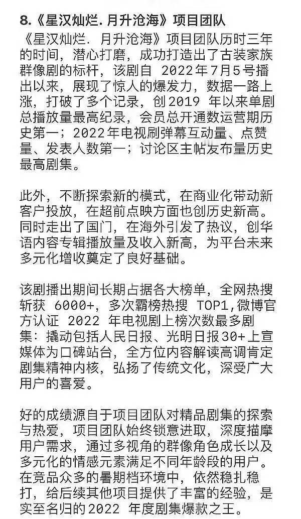 “我们推出了备受欢迎的定制剧,例如《星汉灿烂月升沧海,其播放量在中国在线视频平台中排名第一。”