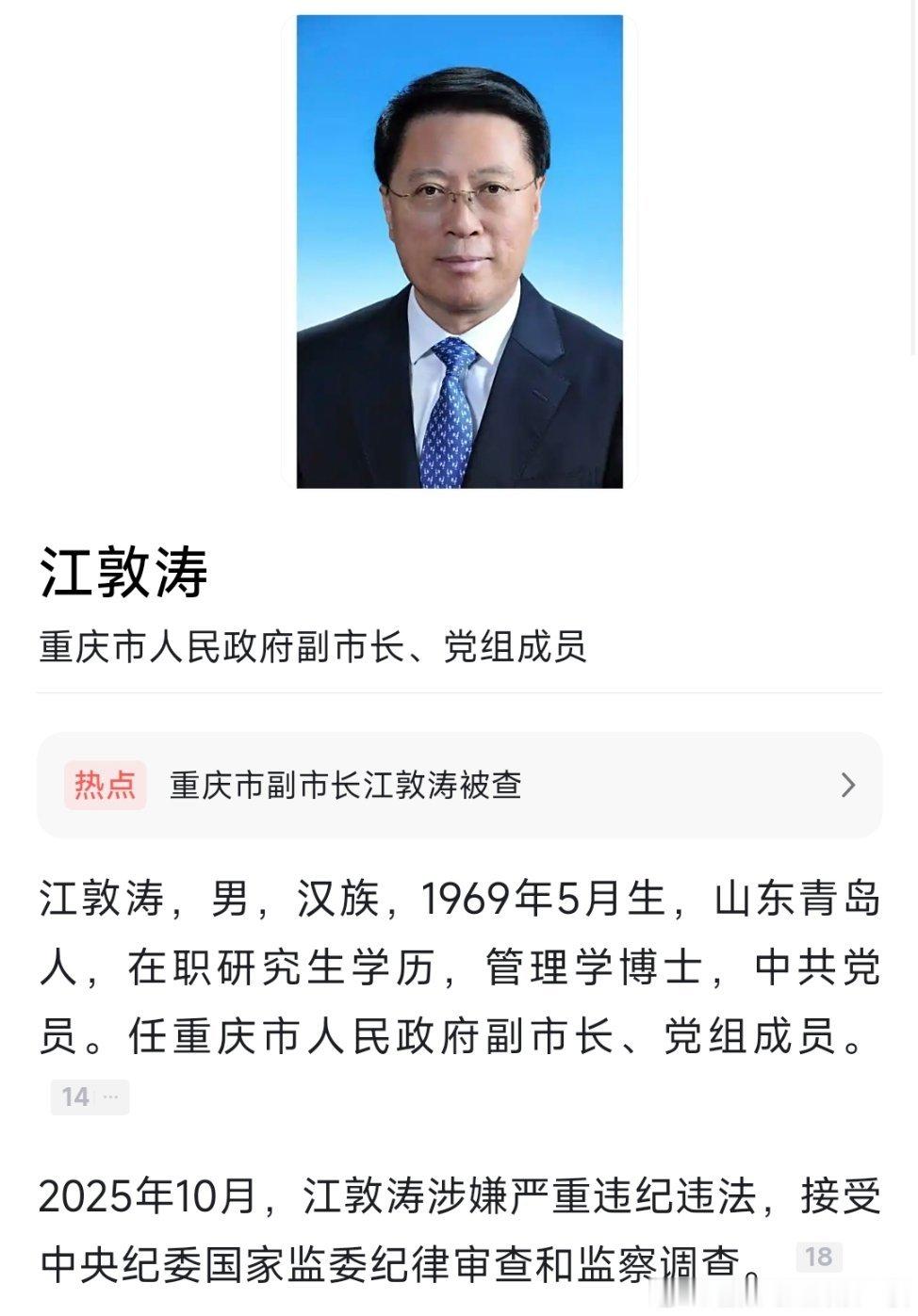 重庆市副市长江敦涛被查重庆市政府党组成员、副市长江敦涛接受中央纪委国家监委纪律审查和监察调查。热点现场