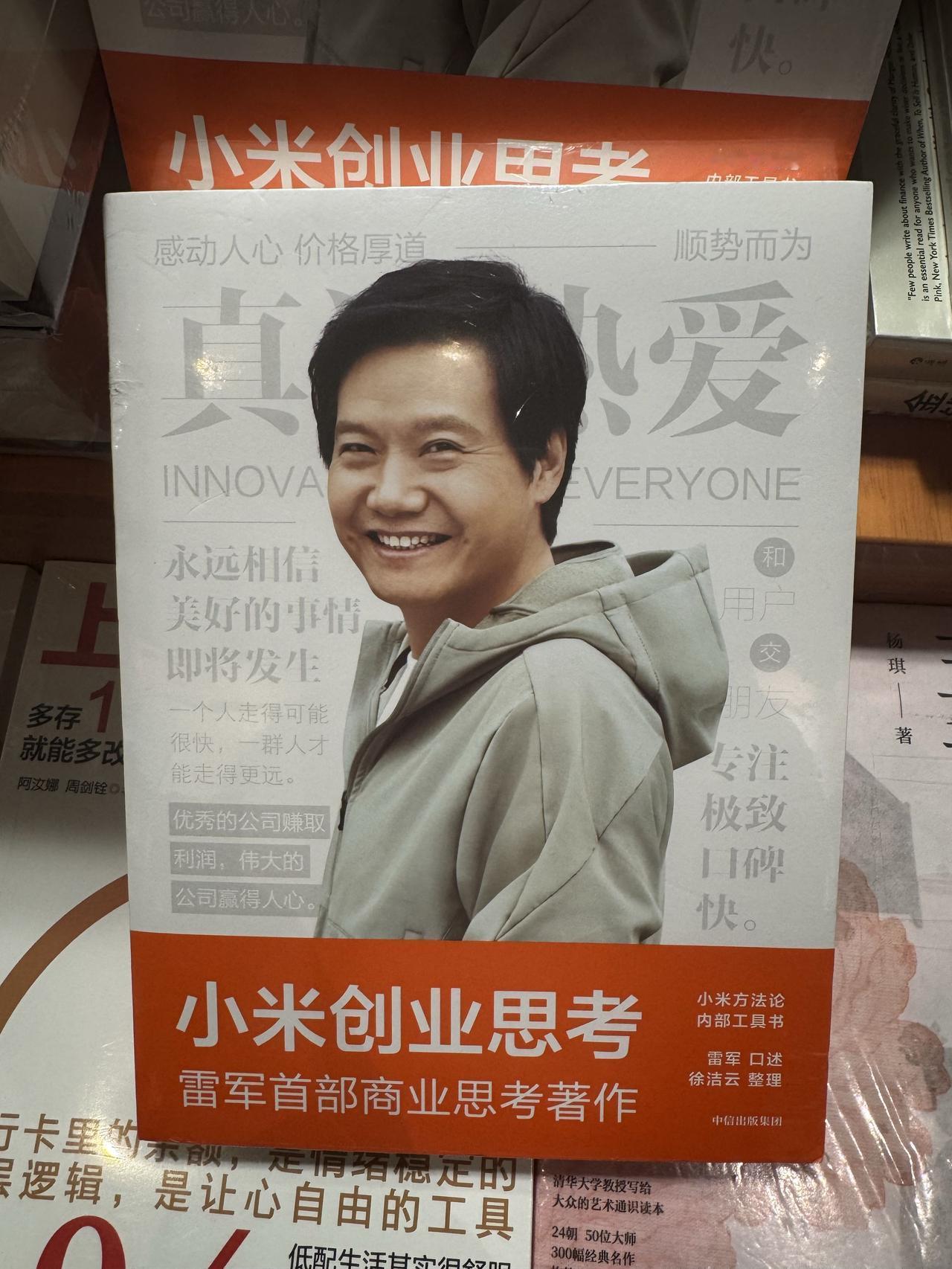 今天又来到西西弗书店买书,又看到了雷总的《小米创业思考》!“真诚热爱”这四个字特别醒目! 联想到当下的舆论风波,一些网友关于“小字备注”“雷氏对比”的吐槽,又觉得“真诚”二字显得特别刺眼! 曾经,小米用“专注、极致、口碑、快”七字诀,在市场上所向披靡! 如今,企业发展到一定高度,我觉得应该再加入两个字,那就是——真诚、真诚、真诚——重要的事情说三遍! 也许,少一点套路,多一些真诚;少一些山寨,多一些创新,才能挽回多年来积累的好口碑,才能在汽车行业走得更远! 小米雷军创业故事