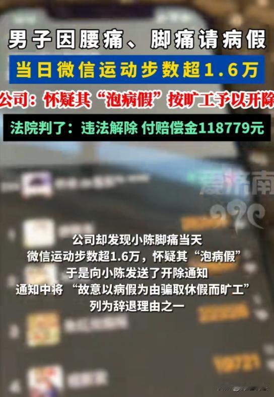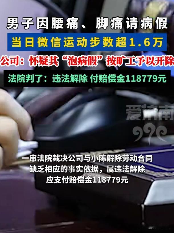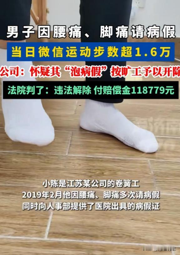“打工人太不容易了!”江苏,男子因伤找单位请了病假,可单位有人发现男子请假这天,运动步数竟高达16949步,为此单位专门调了监控,发现男子还可以跑着上班,这不是明摆着骗人吗?很快单位做出决定,以男子拿病假骗取休假为由将其开除,男子不服提起仲裁,终获近12万的补偿,这下单位不平衡了,提起上诉,最后的判决大快人心! 半岛晨报十月二十四日报道了这则男子因伤病请假,最终却遭单位认为其请假病假为由惨遭开除,幸好最后的判决结果,成功帮助男子维权的新闻。 事情发生在二零一九年,陈某因为老家的工资实在太低,便只身来到江苏某工厂打工。 当年二月二十二号这天,陈某正在流水线上工作时,突然把腰给扭伤了,当场就疼的他冷汗直流,不过为了能拿更多的工资,休息片刻后他还是选择咬牙坚持到了下班。 下班后趴在床上休息的陈某仗着自己年轻,想着扛过去就没事了。 不料随着时间的推移,陈某发觉腰伤越来越严重,甚至连翻身都很困难,看来这看病的钱是省不下来了。 第二天一大早,陈某请了半天后找到附近的医院检查,最终被确诊为腰部扭伤,大夫建议他先休息几天,可陈某还是舍不得到手的工资,当天下午又回到了工作岗位。 咬牙坚持了几天后,陈某实在是扛不住了,在二月二十五号这天找到人事请假,为此他详细说明了受伤的过程,并拿出了院方的病假证明。 顺利请假后陈某开始了治疗,很快他就感觉到身体舒服了很多,最终在三月四号开始上班了。 俗话说伤筋动骨一百天,这几天的功夫当然不够痊愈的,特别是他们这种高强度的工作,仅仅两天后他的腰伤就复发了。 趁着周末休息的时候陈某要去检查,诊断结果果然还是“腰肌扭伤”,大夫严肃的表示他的腰伤还没有痊愈,如果继续上班,只会导致伤情越来越严重,到时候要花的钱就更多了。 事已至此陈某只好再次请假,这次的病假也很顺利的批了下来。 半个月后假期结束后,感觉到腰伤差不多康复的陈某在三月十八号再次上岗,不料这才工作了半天又感到不舒服,只得以脚痛为由再次请假。 这下子可把人事负责人搞毛了,这才多久就连续请了三次病假,这是真的身体不舒服,还是没事装病? 见状陈某赶紧将院方开出的“右足疼痛”并建议休息一周的诊断书发给了对方。 人事负责人虽然很头痛,但还是告知陈某:按规定需要将病例证明的原件拿到单位备案。 陈某面露难色,表示病历原件都要留着后面复查时给大夫参考,实在是给不了原件。 事已至此负责人只得再次妥协,让他把假条原件和其他资料带来复印。 陈某多次请假的行为引起了管理人员的注意,有人发现从三月二十五号后,陈某隔三岔五就请病假,这次又拿出了“跟骨骨刺”的诊断证明。 人事负责人自然怀疑对方就是故意“泡病假”,便决定好好查查到底是个什么情况。 这一查不打紧,很快发现了异常,比如在三月十八号陈某以脚痛请假这天,他的运动步数竟高达16949步,这一看就不正常啊。 要知道一个身体健康的成年人,一天下来都很难走这么多步,更何况还是一个有脚伤的人。 负责人决定继续深挖,很快又发现了问题,十八号当天陈某竟是跑步来到厂区的,这不直接证明了他的脚伤诊断证明就是伪造的嘛! 四月三号单位直接决定将陈某开除,理由就是拿病假骗取休假。 还在养伤的陈某得知被无故开除,更是大呼冤枉,表示真的是受伤了,可单位这边态度十分坚决,没办法为了维权,陈某只得提起了劳动仲裁。 仲裁结果很快出来了,认定单位违约,需支付陈某118779元的赔偿金。 单位也觉得很冤枉,直接提起上诉,并提交了步数记录和厂区的监控证明。 那么,从法律角度,该如何看待这件事呢? 1、如何评价陈某和单位的行为? 根据《劳动合同法》第三十九条规定,劳动者有下列情形之一,用人单位可以解除劳动合同:在试用期间被证明不符合录用条件的;严重违反用人单位的规章制度的;严重失职,营私舞弊,给用人单位造成重大损害的;劳动者同时与其他用人单位建立劳动关系,对完成本单位的工作任务造成严重影响,或者经用人单位提出,拒不改正的。 本案中陈某每次都提交了院方提供的,包括诊断证明,其行为符合正常的病假制度。 反观单位这边,仅用陈某的运动步数和对方跑步进入厂区的录像作为证据,明显缺乏充足依据。 尽管陈某没有提交病例原件,但他后续配合提交了复印件,在制度上也是合理的。 如果单位坚持怀疑病假的真实性问题,可根据《劳动合同法》第40条规定的有关启动医疗期复核或协商解除程序,而不是这样,直接以非直接适用过失性将陈某辞退。 2、判决结果: 审理后认为只凭运动步数和监控证明,和陈某右脚是否正常没有直接联系,且陈某履行了请假义务,行为不构成旷工,单位以此为由将其开除,得不到法律的支持。 最终判决:驳回单位的诉求。 单位不服判决,提起了上诉,二审认为一审事实清楚,判决合理,维持原判。 那么,对此您怎么看?