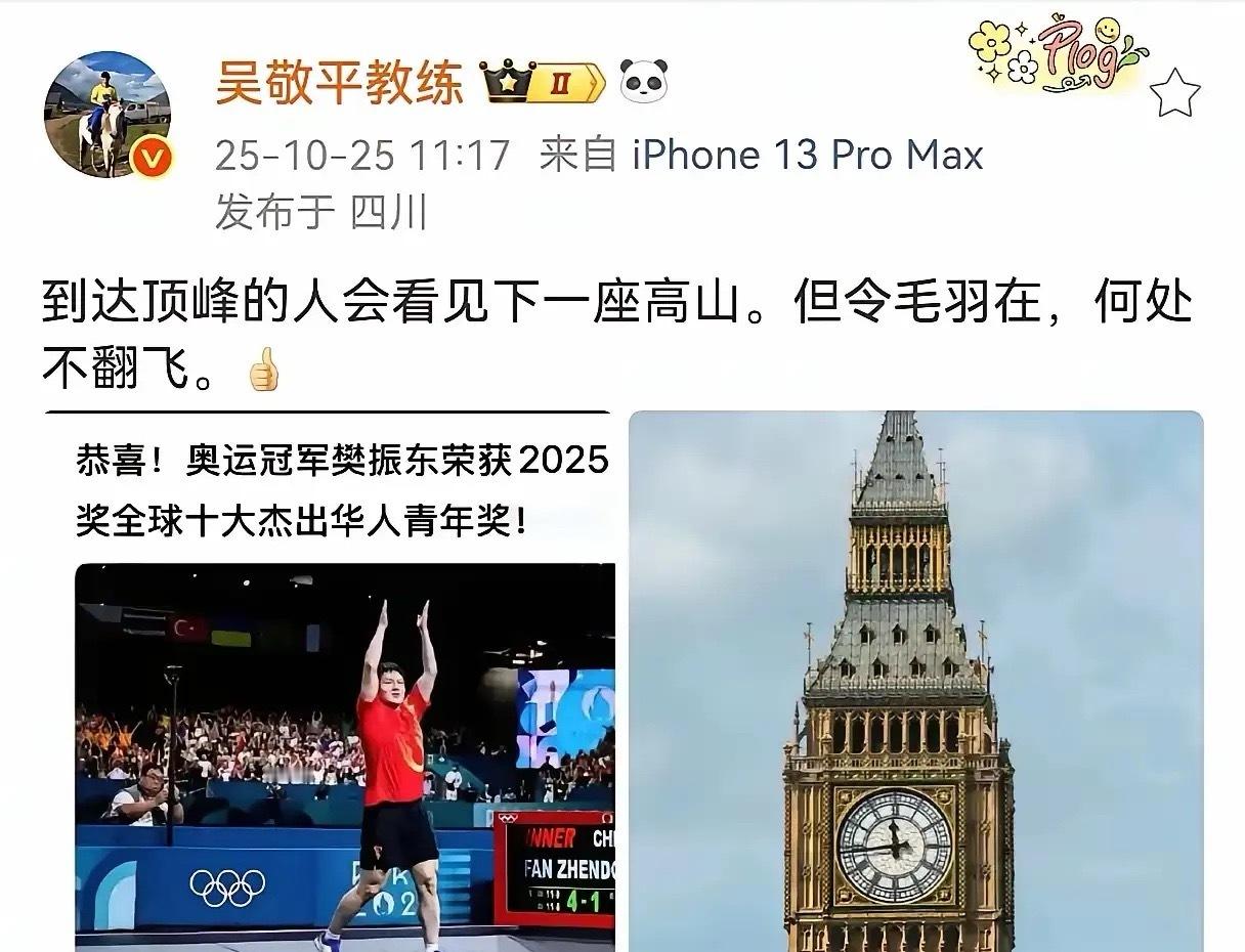 樊振东斩获大奖,吴敬平教练发文庆贺,引“但令毛羽在,何处不反飞”肯定爱徒实力。此
