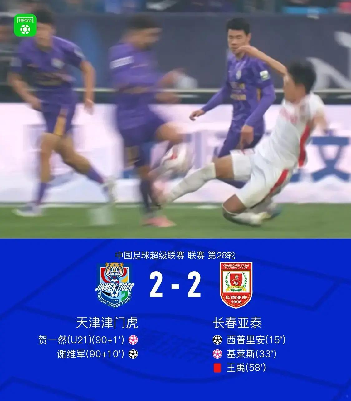 10月25日中超第28轮,天津津门虎主场对阵长春亚泰。上半场,西普里安进球+造基莱斯乌龙。下半场,王禹飞铲染红,补时阶段,贺一然自摆乌龙,最后时刻谢维军绝平。最终比分天津津门虎2-2长春亚泰。