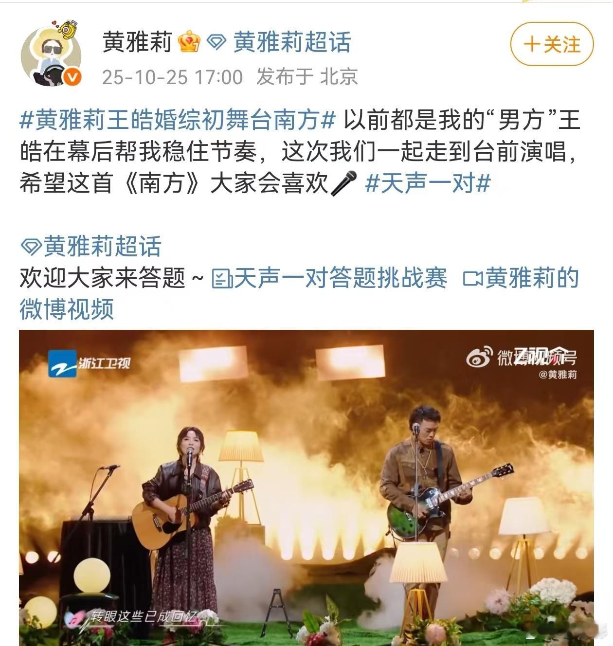 黄雅莉王皓这哪是合唱这是撒糖 《天声一对》黄雅莉王皓这哪是合唱这是撒糖,果然真夫妻的舞台就是很甜蜜的呀,而且两个人在对视的时候也是很有默契感