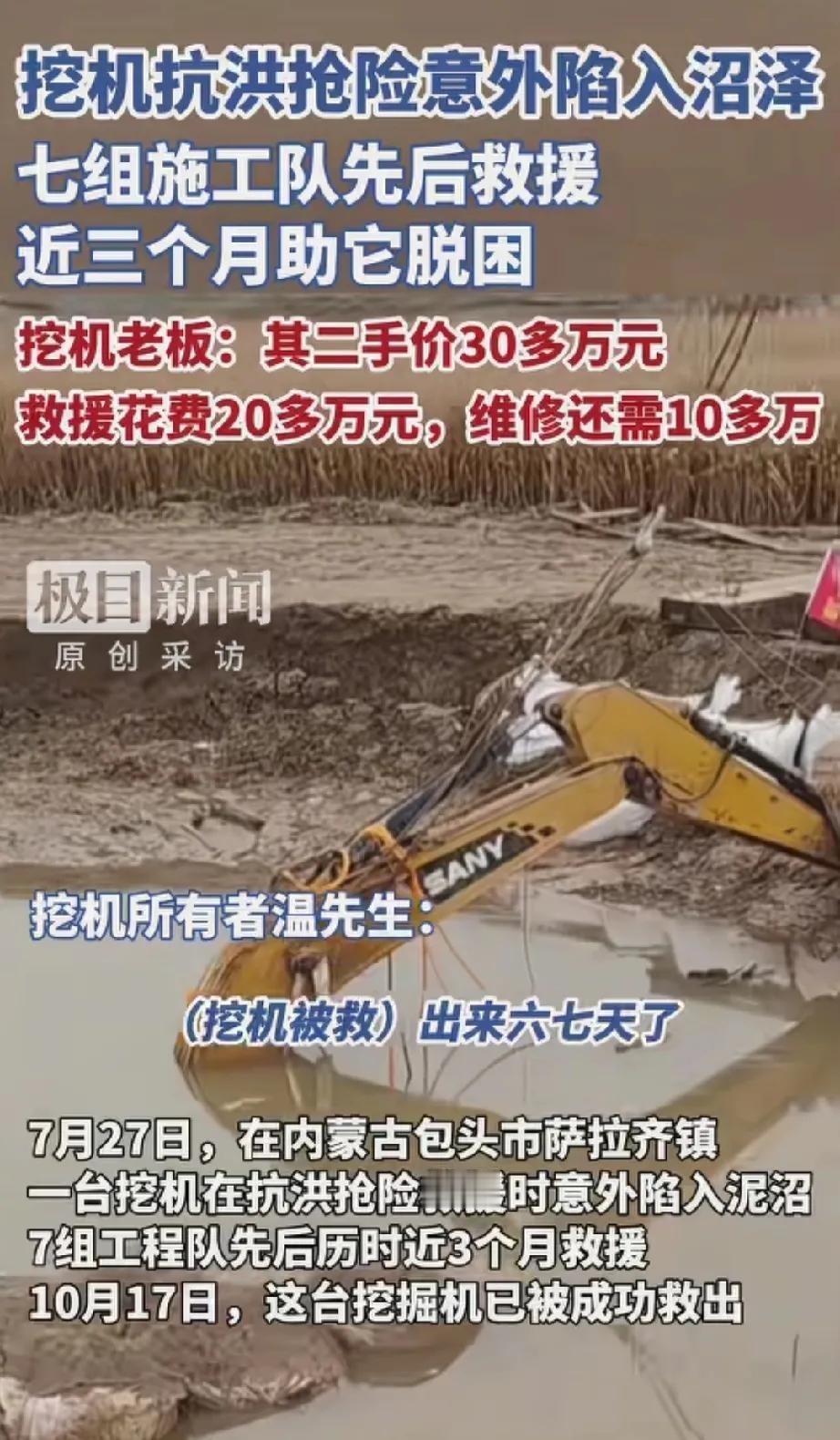 您听说过为救一台挖掘机,花了将近三个月,动用了七支专业队伍,最后算下来,救援费都快赶上机器本身价格了吗?这听起来像天方夜谭,但却是前不久真实发生的一场一波三折、代价高昂的“特别营救”。 事情要从几个月前的一场抗洪抢险说起。当时,一台挖掘机正在一线奋力作业,保卫人民群众的生命财产安全。然而,天有不测风云,这台“功臣”挖机在作业过程中,意外深陷沼泽,庞大的身躯完全被困,动弹不得。 这一陷,可就开启了一场漫长的拉锯战。挖机老板先后请来了七组不同的专业施工救援队!大家想尽了各种办法,从最初的试图拖拽,到后来不得不动用更大型的设备,甚至采取了筑坝、排水等“土洋结合”的招数。现场可以说是用尽了浑身解数,与这片淤泥展开了持久战。 时间一天天过去,足足用了近三个月,这台深陷泥潭的“铁牛”才终于被成功拖拽上岸,重见天日。 那么,花费如此巨大的人力物力去救援一台挖机,到底值不值呢?我们算了一笔账。据挖机老板透露,这台挖掘机是二手的,市场价大概在30多万元。而为了这次救援,前前后后光是直接花费就高达20多万元!这还没完,机器在水里泥里泡了那么久,上岸后还需要进行一次大修,预计维修费用还得10多万元。 这样算下来,救援加维修的总成本,已经超过了这台挖掘机本身的二手价值。但在老板看来,这台并肩作战的“老伙计”不仅是资产,更是在危难时刻立下汗马功劳的战友,这份情感和坚持,或许已经无法用简单的数字来衡量。 一场意外,一场持续三个月的救援,引发的不仅是关于价值的讨论,更是一段关于不舍与坚持的故事。