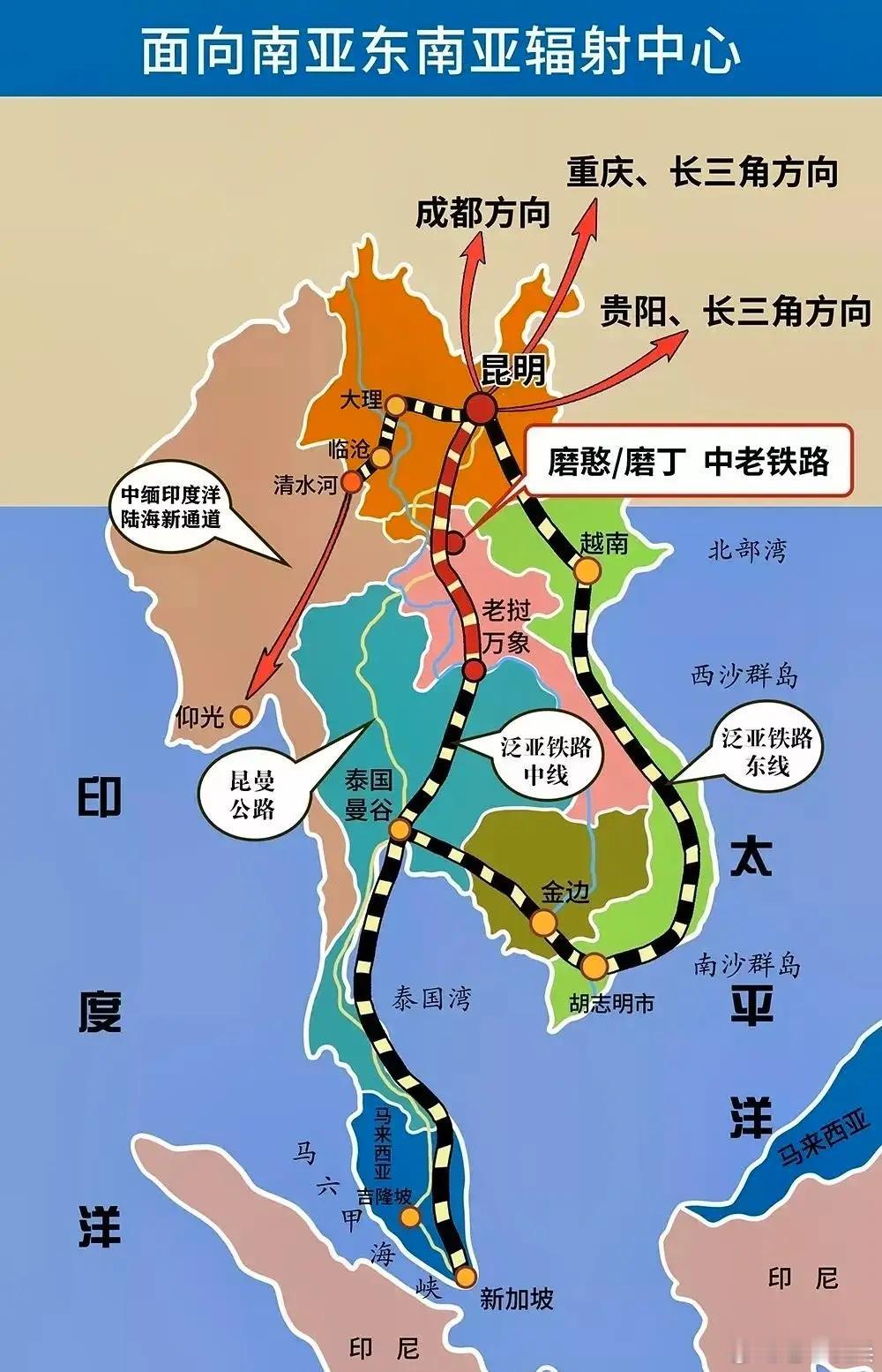 从中国这边来说,想要整合东南亚的资源和市场,首先把政治因素搞定之后,就是在东南亚大修铁路和高铁,形成东南亚铁路网(高铁网)。