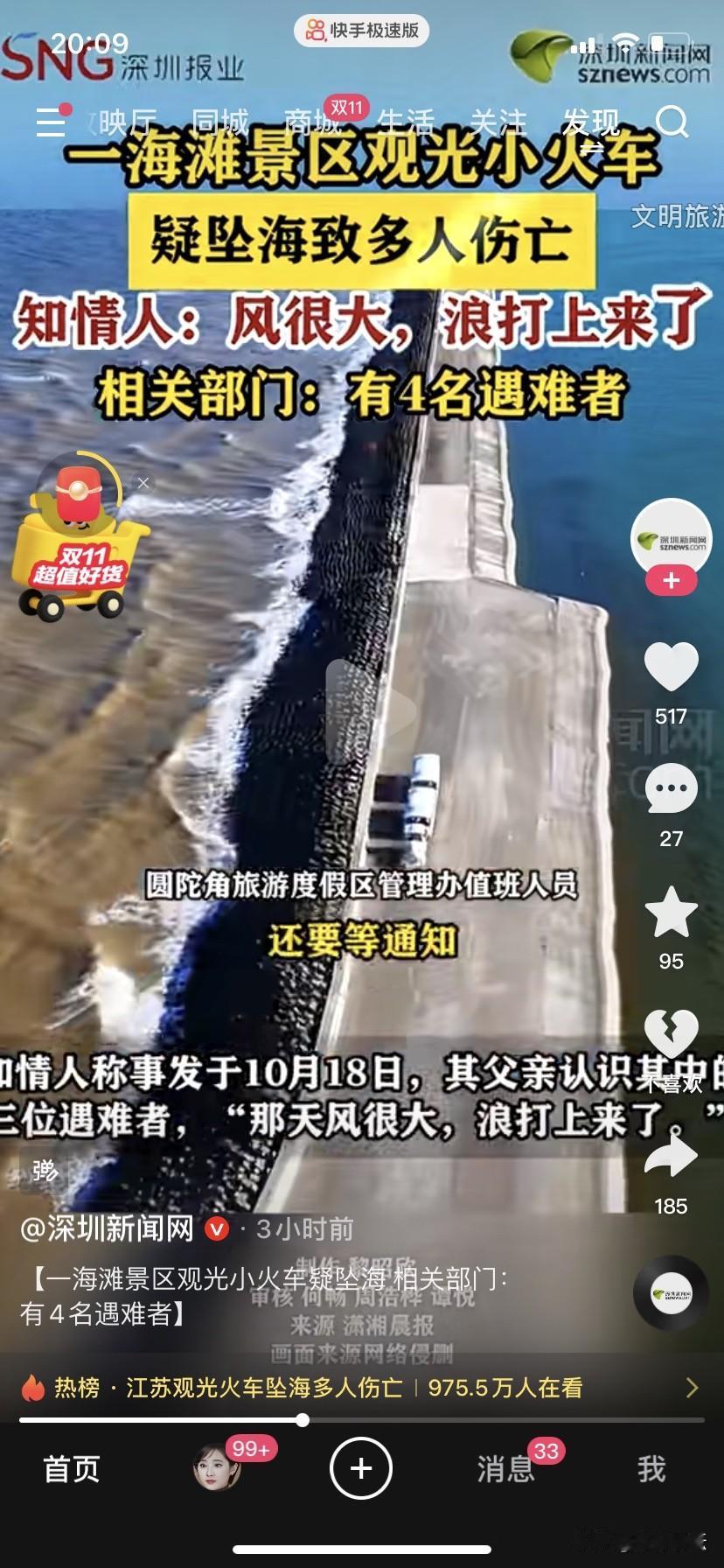 太危险了,江苏景区观光小火车坠海导致四人死亡。 2025年10月18日在江苏南通启东市黄金海滩景区附近发生了一起观光小火车坠海事故,有四名观光旅客在这起事故中遇难。 据知情人描述,当时风浪风很大,浪打上来了,一车人就被海浪卷走了。 画面可以看到:观光小火车没有轨道,周围也没有围栏,看着都觉得太危险了,不知道当地监管部门怎么让他们拿到营业执照的? 目前涉事旅游度假区已停止运营,事故原因还在调查中。[祈祷][祈祷]