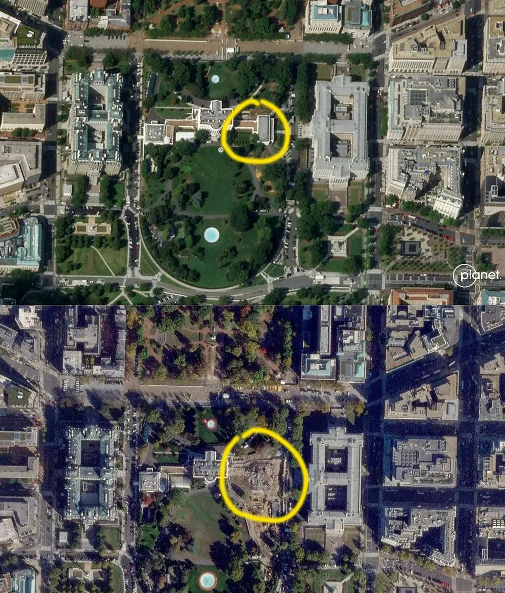 特朗普找的折房公司效率很高,白宫宴会厅短短两三天就拆完,卫星图像显示特朗普已完成了对白宫东翼的拆除。西边什么时候拆呢?正好趁联邦政府关门,一并拆了修Trump大厦![二哈]