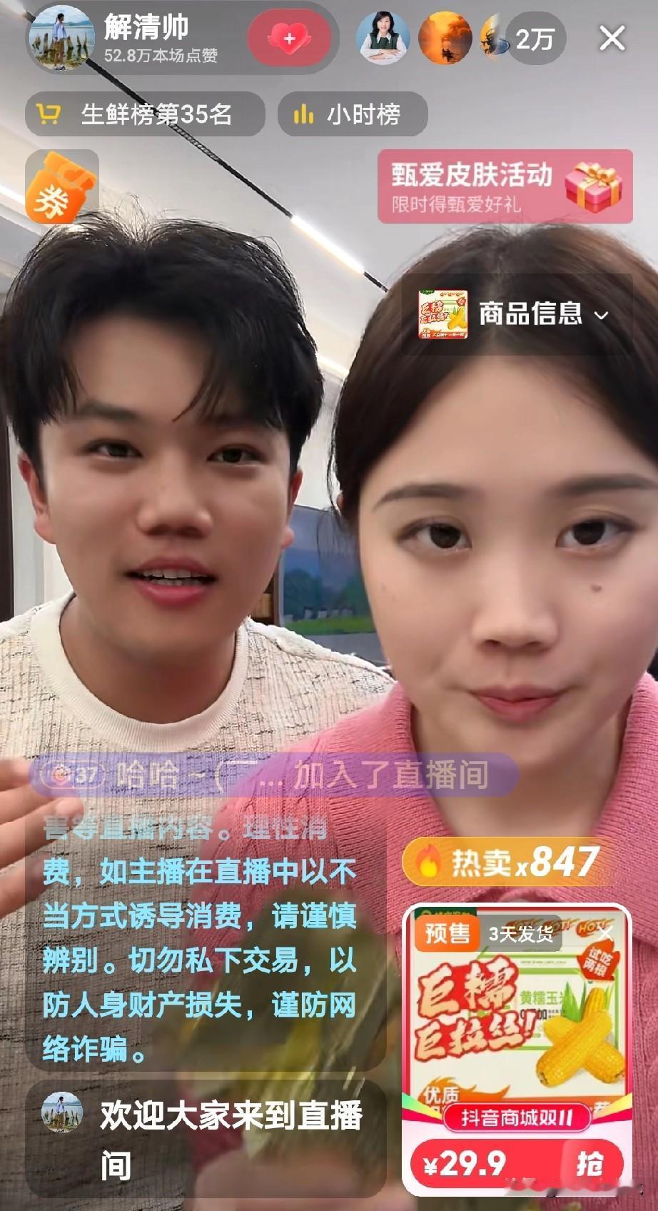 不得不说,解清帅这次婚礼办的很成功, 婚后第一场直播就迎来4万人在线观看, 并且涨了30万多个小可爱, 刚刚还看到了解清帅卖上了货了,速冻玉米,看样子很好吃的样子, 支持的人也特别多, 解清帅还说过几天还会给大家开播的,