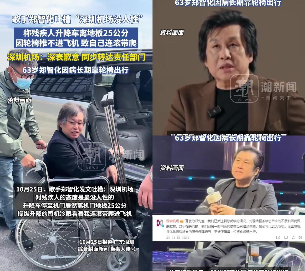 唱着“风雨中这点痛算什么”的郑智化,今天在深圳机场痛得破防了! 63岁的他坐了几十年轮椅,昨天用残疾人升降车时,车和机舱差了25公分,半条腿高的坎,轮椅根本推不进去。 司机就站旁边冷眼旁观,他只能连滚带爬进飞机,说自己“算有涵养的,但这没人性的态度真忍不了”。 有人说他是名人才能发声,有人说这是特殊群体的普遍委屈,还有人说要是普通人,可能连道歉都没有。 《星星点灯》的光,不该照不到机场这25公分;《水手》的“不服输”,也不该输给没人管的漏洞啊! 机场道歉了,但大家觉得,如果是普通轮椅使用者,能这么快被看见吗?