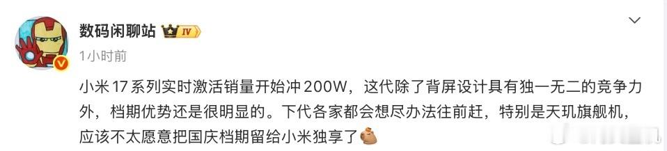 这才一个月时间就200万台了?谁能想到,今年所有新手机只有小米17系列是真的爆款,今年小米打时间差和独特设计冲销量。我给一波预言:明年小米的打法才是真正的配置跃升,且不涨价。主打的就是等众人模仿的时候,再高配低价去断其它家的冲高路,以及销量碾压。小米17 pro max背屏设计确实是一个亮点,比较奇怪的是,手机后面加背屏一个简单的工艺设计,为何这么多年独独小米在尝试,且借此成功的让旗舰机销量远超之前几年,甚至是之前几年销量总和?