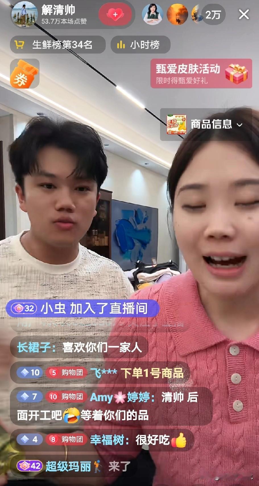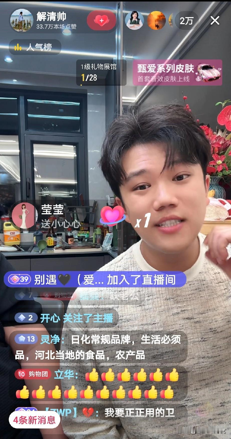 解清帅通过结婚又一次复活, 之前解清帅不知道怎么回事突然被网络攻击, 甚至不能直播带货了, 但是通过后面的拯救解清帅今天终于又复活了,活力满满, 解清帅今天突然开播,人亲飙升到4万在线观看, 有很多粉丝已经迫不及待的喊话让解清帅出来直播带货, 有要纸巾的,日用品,化妆品的…… 后续解清帅应该马上就出来直播带货了,大家敬请期待吧![呲牙]