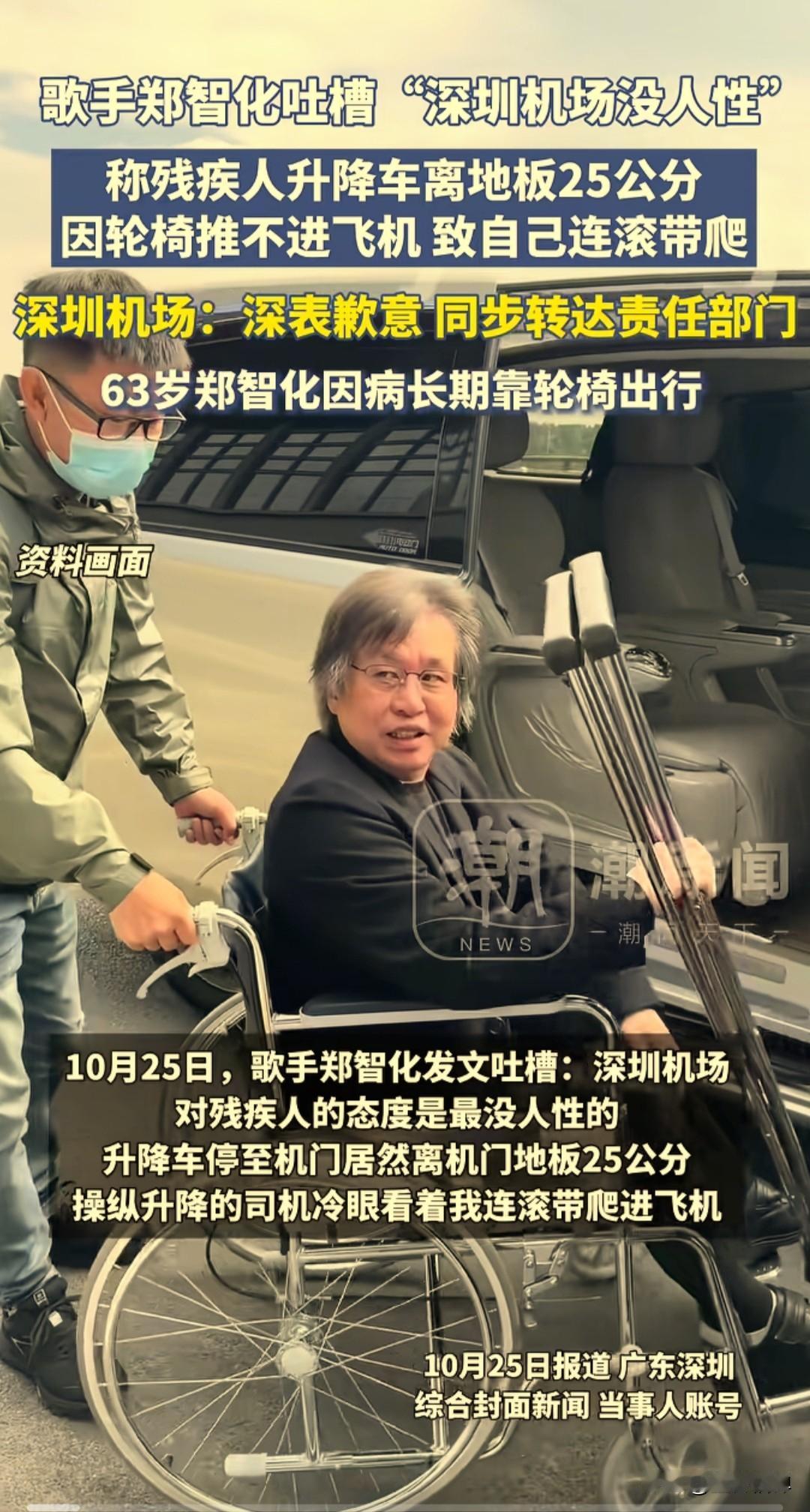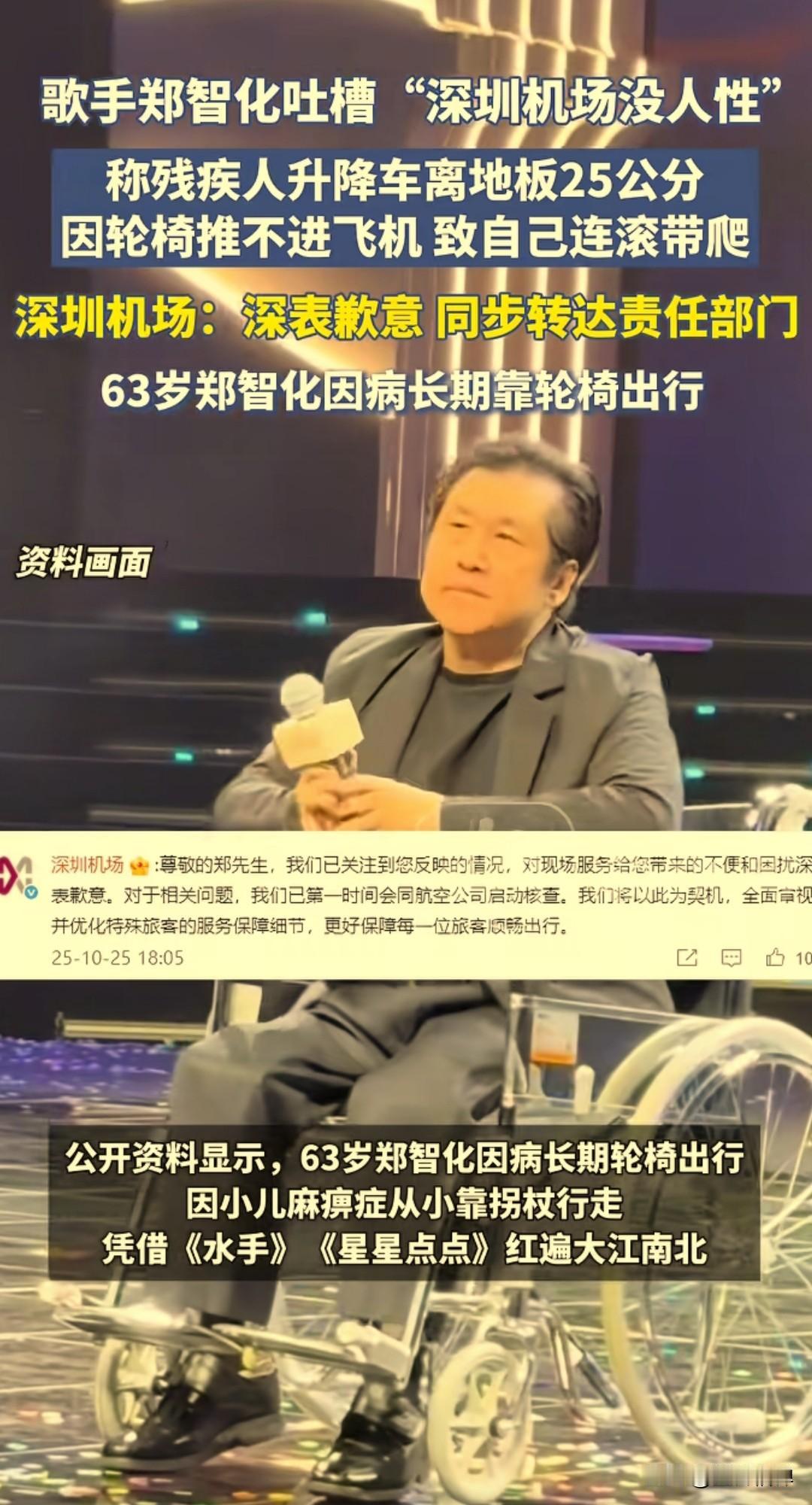 10月25日,歌手郑智化在社交平台发文,怒斥深圳机场对残疾人的态度最没人性,由于升降车离机门地板25公分,他坐轮椅没办法进机门,司机不愿把升降板提高,冷眼看着他连滚带爬进飞机。 郑智化说自己已经算是一个有涵养的人了,但对于这种没人性的行为跟态度他忍无可忍。 事件曝光后,深圳机场在郑智化的社交媒体平台评论区表示了歉意,说已经关注到他反映的情况,他们已经第一时间同航空公司一起启动核查,后续会优化特殊旅客的服务保障细节。 歌手李琛也在此事评论区留言,他自己同样也需要轮椅出行,也曾有过类似经历,希望能够提高无障碍设施和服务意识及配套设施的重视。 郑智化是华语乐坛一位极具标志性的歌手,早年创作的歌曲《水手》、《星星点灯》、《年轻时代》等歌曲脍炙人口,风靡大江南北。 《水手》也是他广为人知的代表作,歌词“他说风雨中这点痛算什么,擦干泪不要问为什么,擦干泪不要怕,之前我们还有梦”激励了无数身处逆境的人,成为一代人的集体记忆和精神图腾。 现年63岁的郑智化因幼年患小儿麻痹症,从小依靠拐杖行走,出行需依靠轮椅。此事件也暴露出部分公共交通在无障碍设施管理和特殊旅客服务意识上可能存在的短板。 希望此事能成为一个契机,推动公共交通领域无障碍设施和服务的完善,让每一位旅客的出行都能更加顺畅和有尊严。