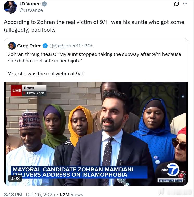 根据佐兰的说法,9/11的真正受害者是他的姑姑,因为她(据称)在那天被人“用异样的眼神”看了几眼。