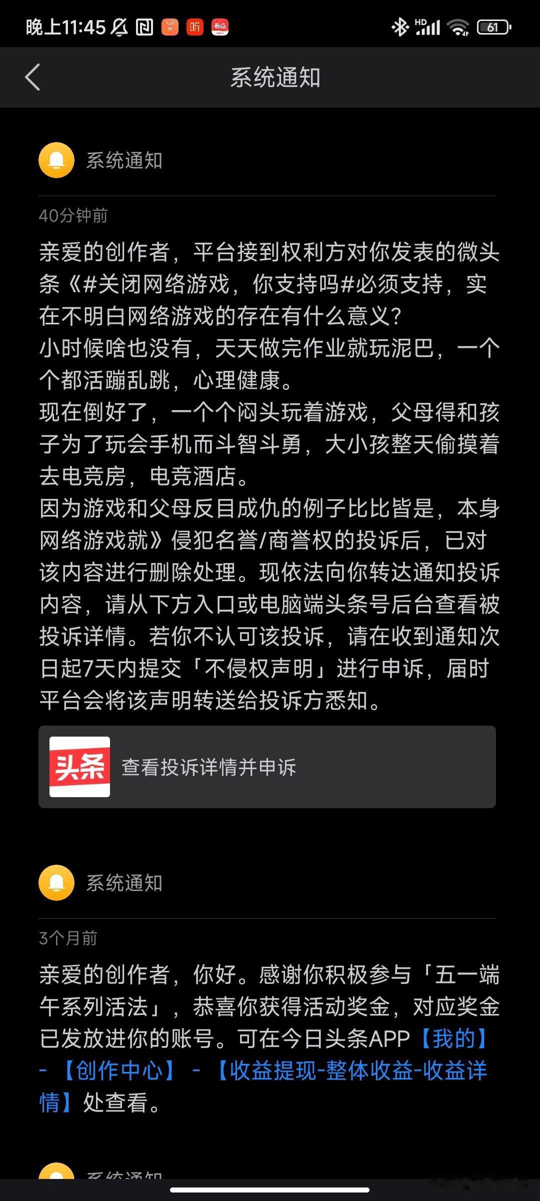 某讯公司真是牛叉。 前几天平台问答:关闭游戏 ,你支持吗? 我对此很有感触,随手写了篇微头条,表明自己的态度,和现实情况,结果被某讯公司投诉,认为我恶意歪曲误导公众。 贵公司还真是太看得起我了,平台不进行问答,我会写吗?还说什么以此挑起网民热议,制造话题,我的行为对某公司的形象造成了极为负面的影响。 游戏也不是你一家公司有 ,你心虚个啥?再说我也没说哪家的游戏吧?何况游戏对当前的孩子们造成多少影响,需要我说出来吗?全社会都心知肚明。 总是有人认为写头条就是制造流量,写一篇头条有几个钱?有必要吗?我们写,只是这个社会需要有不同的声音表达出来。
