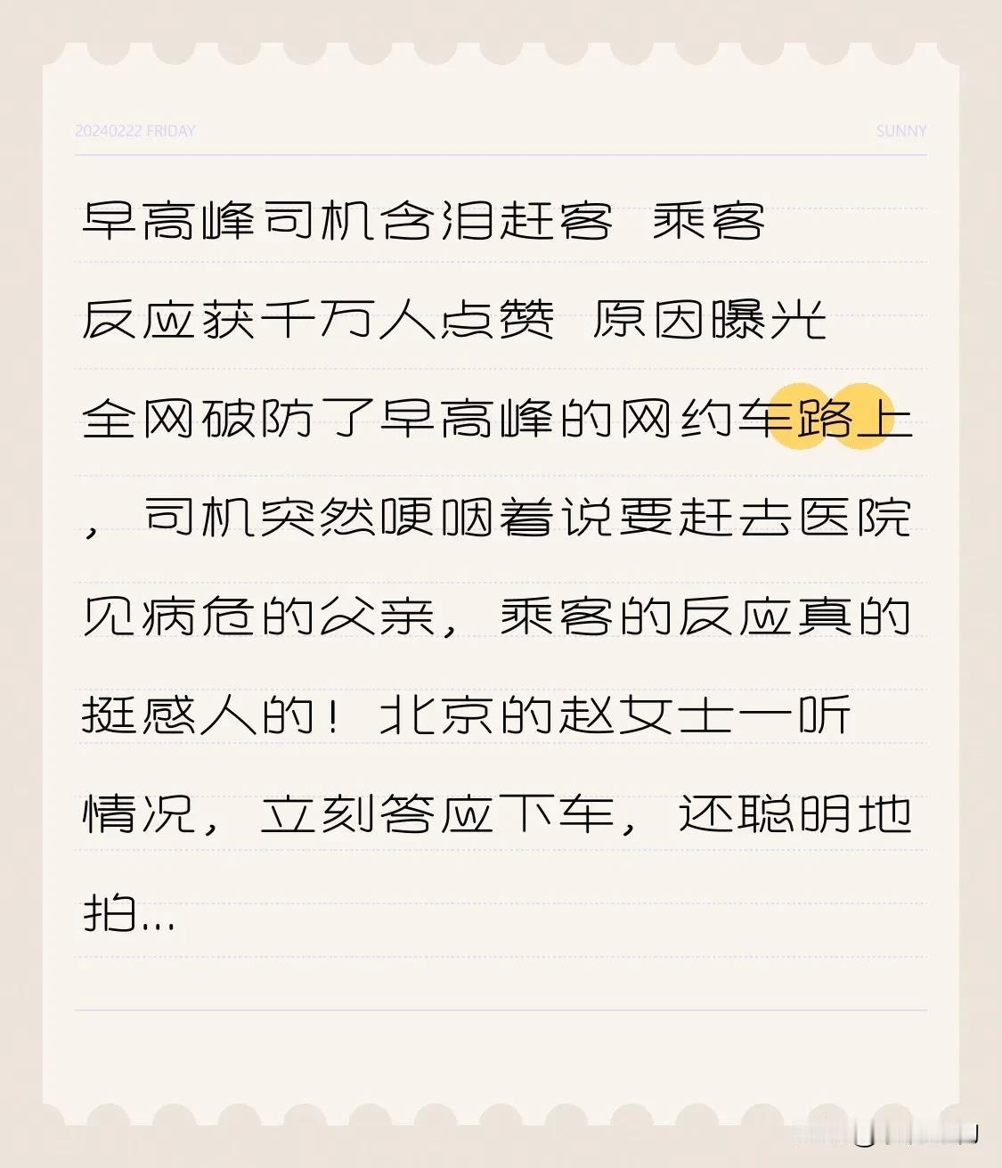 早高峰司机含泪赶客 乘客反应获千万人点赞 原因曝光全网破防了 早高峰的网约车路上,司机突然哽咽着说要赶去医院见病危的父亲,乘客的反应真的挺感人的! 北京的赵女士一听情况,立刻答应下车,还聪明地拍了照片留作证据,免得后续有麻烦。她重新打车导致上班迟到,没想到老板特别支持:“这种紧急情况,大家都会体谅的!” 赵女士觉得这很平常:“我想很多人遇到也会这么做。”她心里最惦记的是司机能不能见到父亲最后一面。 这件事上了热搜之后,网友们纷纷点赞:这才是我们该有的暖心温度!有时候一个小小的善意,或许就能点亮别人的艰难时刻。 温暖常常藏在细节里,就像赵女士说的“事情比较特殊”,换位思考其实一点都不难。你生活里有没有遇到过这种互相体谅的温暖小事?快来聊聊你的故事吧! 出租车司机 出租车司机赶客