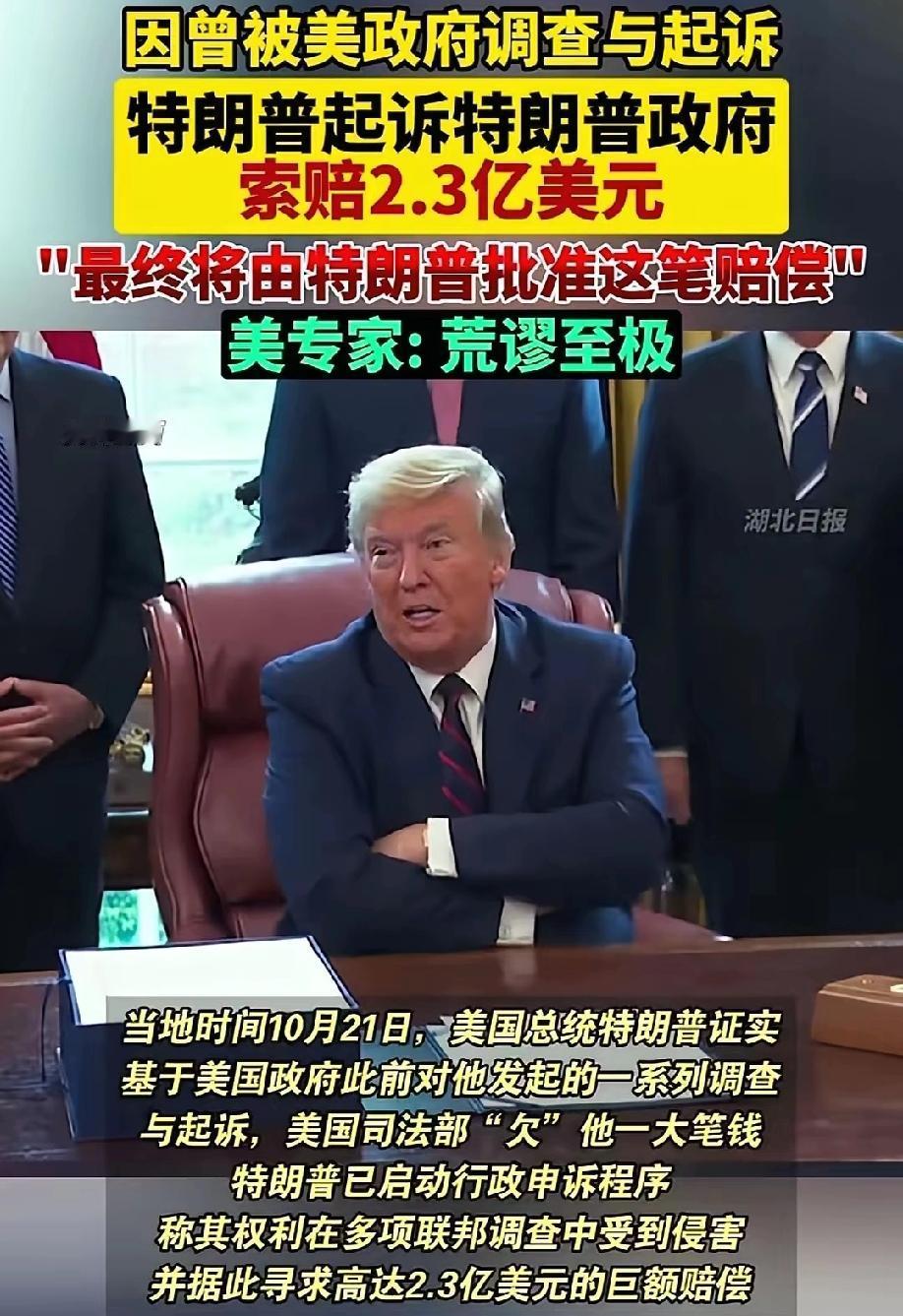 自己起诉自己的政府,然后自己让自己的政府败诉,再然后自己批准自己的政府赔偿自己2.3亿美元。 这么绝的捞钱招法是人类能想出来的吗?就算能想出来,那也是人类能干出来的事吗?可特朗普不但能想出来还能干出来。特朗普说自己是天才,一点都没冤枉自己!