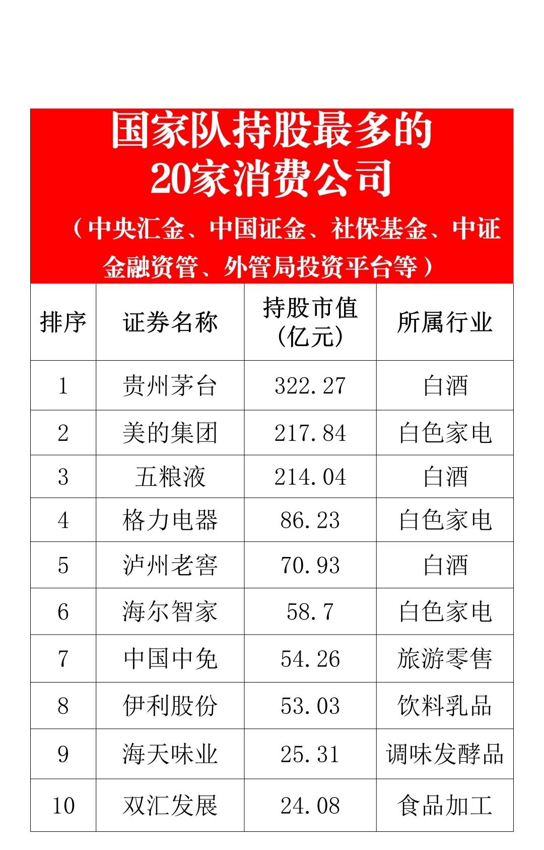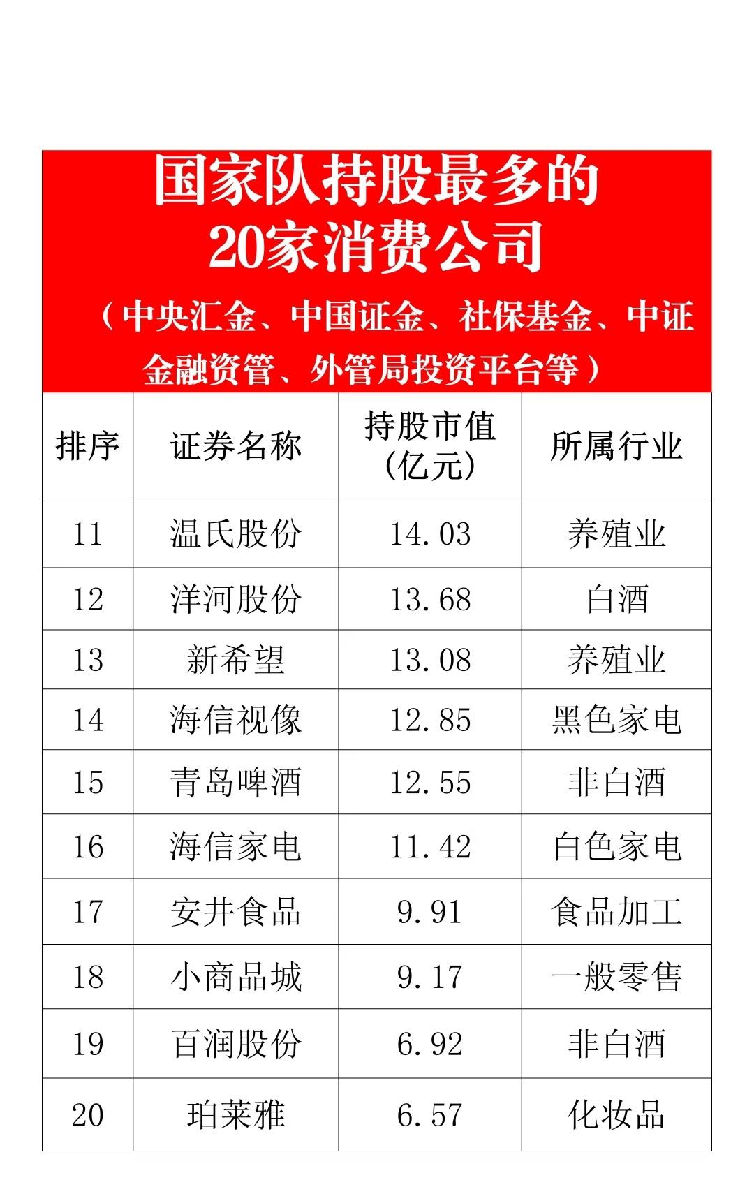 “国家队持股最多的20家消费公司”榜单,其中“国家队”主要包括中央汇金、中国证金