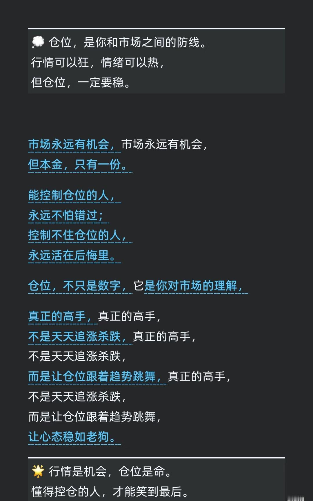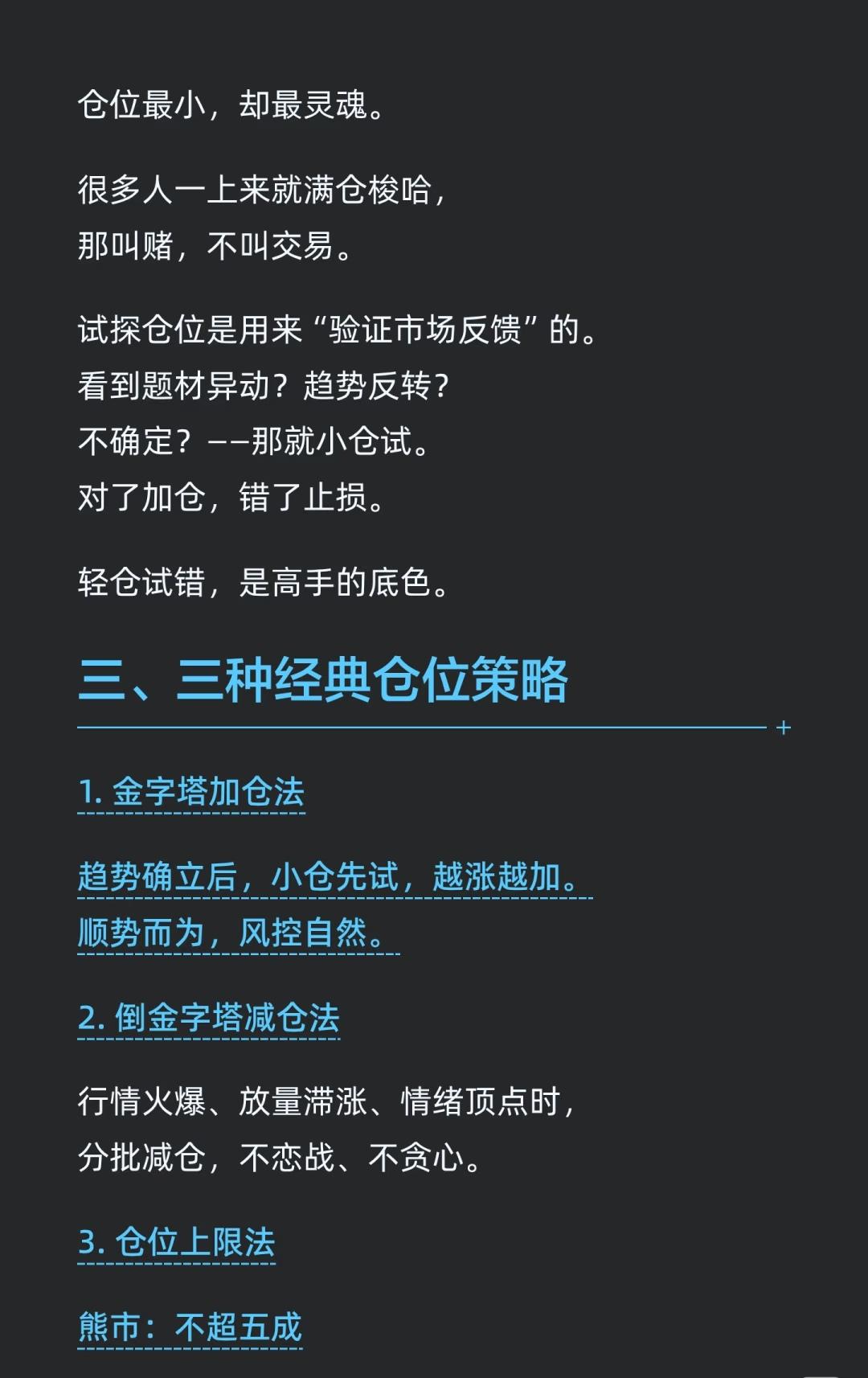 以下是股票投资中仓位管理重要性及实战方法的完整投资知识体系,核心思想可以概括为: 🧠 一、核心理念:仓位管理是投资成败的关键 1. 仓位比选股和买点更重要 - 很多人认为炒股的核心在于“选对股”或“抓住买卖点”,但实际上,仓位控制才是真正的战略问题,而买卖只是战术。 - 选错股但仓位轻,损失可控;方向对但仓位过重,反而容易被短期波动洗出局。 - 股市比的不是谁涨得快,而是谁能“活得久”。仓位是投资者的“安全垫”。 💡 “没有仓位管理,再好的逻辑都是空中楼阁。” 🎯 二、仓位管理的核心框架:三层仓位法 图片中提出了一个非常实用且经典的仓位分配模型——“三层仓位法”,分别是: ① 战略仓位(约40%)—— 稳中求胜 - 用于抓住中长期趋势,是投资者对逻辑和趋势的信仰仓位。 - 在市场主升浪或经济上行期坚定持有,不轻易动摇。 - 代表:你对这个市场、行业或公司长期看好的“底气”。 ✅ 原则:趋势未坏,稳坐钓鱼台。 ② 战术仓位(约30%)—— 灵活机动 - 用于应对短期市场节奏、板块轮动、事件驱动等中短期机会。 - 操作策略讲究 “涨多减仓、跌深加仓”,目标是 “进可攻,退可守”。 - 是你调仓换股、抓住波动机会的利器。 ✅ 原则:仓位在手,攻防自由。 📌 小贴士:这一部分仓位让你在市场变化中保持主动权。 ③ 试探仓位(约10%-20%,图中未给出具体比例,但极为关键)—— 以小博大 - 用于验证市场反馈,比如当看到某个题材异动或趋势可能反转时,先用小仓位试探。 - 轻仓试错,是高手的底色。 - 对了可以加仓,错了及时止损,避免情绪化重仓赌博。 ✅ 核心思想:小仓试方向,大仓跟趋势。 🛠️ 三、经典仓位策略补充 除了三层仓位法,图片中还介绍了几种经典且实用的操作策略: 1. 金字塔加仓法 - 趋势确认后,先小仓试探,随着上涨逐步加仓,实现“越涨越加”,顺势加仓,同时控制风险。 2. 倒金字塔减仓法 - 行情火爆、情绪高点、放量滞涨时,应该分批减仓,不贪心、不恋战,保住利润。 3. 仓位上限法 - 特别是在熊市或不确定性较高时,仓位不宜过重,一般建议不超过五成,以控制回撤风险。 ❤️ 四、仓位管理,本质是心态管理 关键观点: - “很多人以为自己在管钱,其实是在管心。” - 重仓时,一根阴线就能让人焦虑失眠;轻仓时,再大的波动也只当是风吹草动。 - 仓位轻时看市场机会,仓位重时看账户盈亏。 高手心态: - 学会“仓位分层 + 情绪分级”,做到: - 行情好时不贪, - 行情差时不慌。 - 震荡市建议仓位:5~7成;牛市建议仓位:8成上限 + 1成防守仓。 - 那1成防守仓,不是为了赚钱,而是为了在恐慌时保持冷静判断力。 ✅ “仓位管理,其实是心态管理。” 🎯 五、仓位是投资者的防线,也是长期生存的命脉 核心总结: - 仓位是投资者与市场之间的最后防线,必须保持稳健。 - 市场机会很多,但本金只有一份,控制仓位就是控制风险。 - 能控制好仓位的人,不害怕错过机会;控制不好的人,永远在追悔莫及。 高手思维: - 真正的高手,不是天天追涨杀跌,而是让仓位随着趋势灵活调整,同时保持心态稳定。 - 仓位不仅是个数字,它代表着你对市场的理解、对风险的认知和对自我的掌控。 ✅ “行情是机会,仓位是命。” ✅ “懂得控仓的人,才能笑到最后。” 📌 总结:一套完整的投资仓位智慧 要点 核心内容 1. 仓位 > 选股/买点 仓位管理是战略,选股和买卖是战术 2. 三层仓位法 战略(40%,稳中求胜)、战术(30%,灵活机动)、试探(以小博大) 3. 经典策略 金字塔加仓、倒金字塔减仓、仓位上限控制 4. 心态决定仓位 重仓心慌,轻仓从容;高手善于情绪与仓位双控 5. 仓位是防线与命脉 控制仓位 = 控制风险,是长期生存与盈利的基础 🔔 给投资者的建议: - 不要满仓梭哈,那不是投资,是赌博。 - 轻仓试错,重仓有据,灵活调整,心态为王。 - 学会让仓位跟着趋势走,而不是让情绪带着仓位跑。