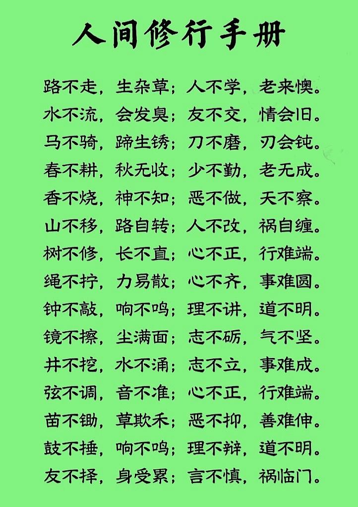 闭嘴少惹祸 守心不出错 见人话少说 闲事别掺和 为人守底线 做事有分寸 修好自己