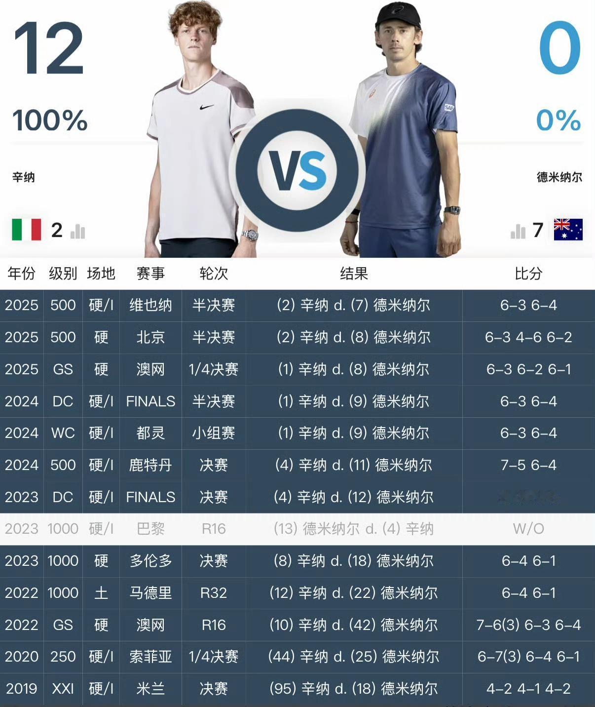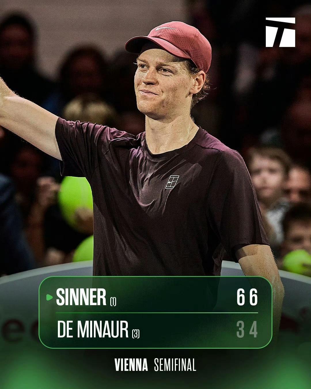 加强升级版药加辛!ATP500维也纳站,继打趴科博利、布勃利克之后,辛纳又6-3/6-4打趴德米纳尔。 辛纳达成室内硬地20连胜。 对阵德米纳尔12连胜。 2025赛季第8次闯入决赛。
