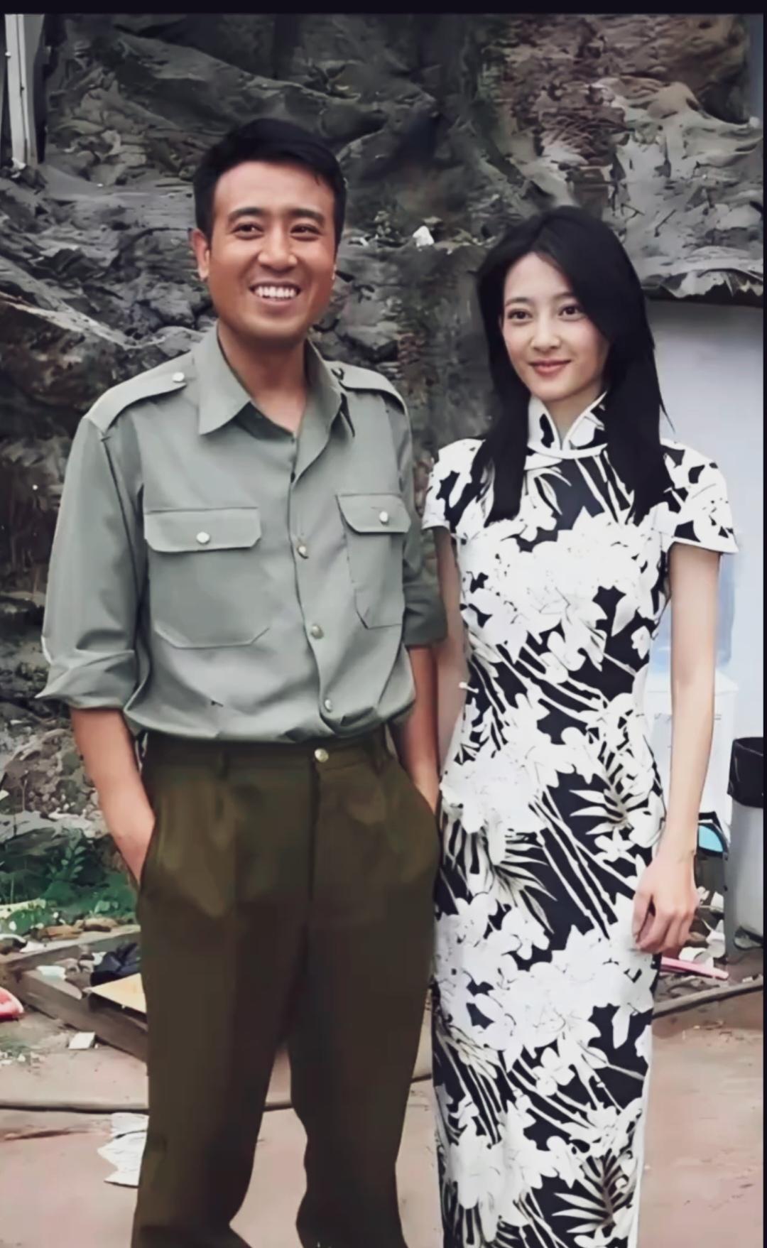于和伟与老搭档王丽坤的一张合影照,于和伟皮肤黝黑,一脸没心没肺的笑容。王丽坤白底黑花旗袍,皮肤白皙笑容含蓄,五官清秀淡雅。#于和伟# #王丽坤#