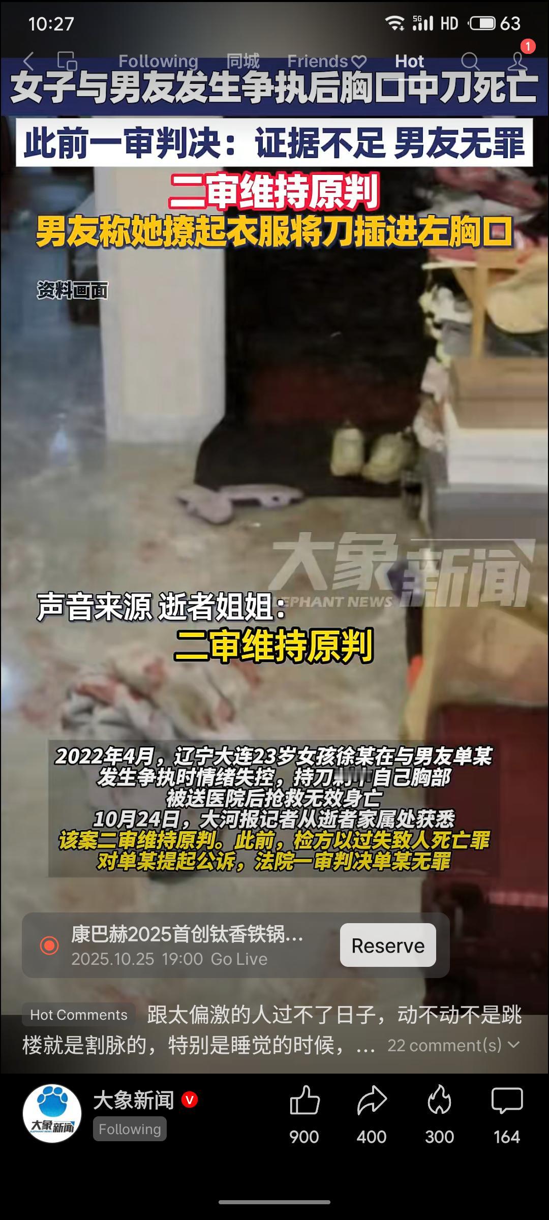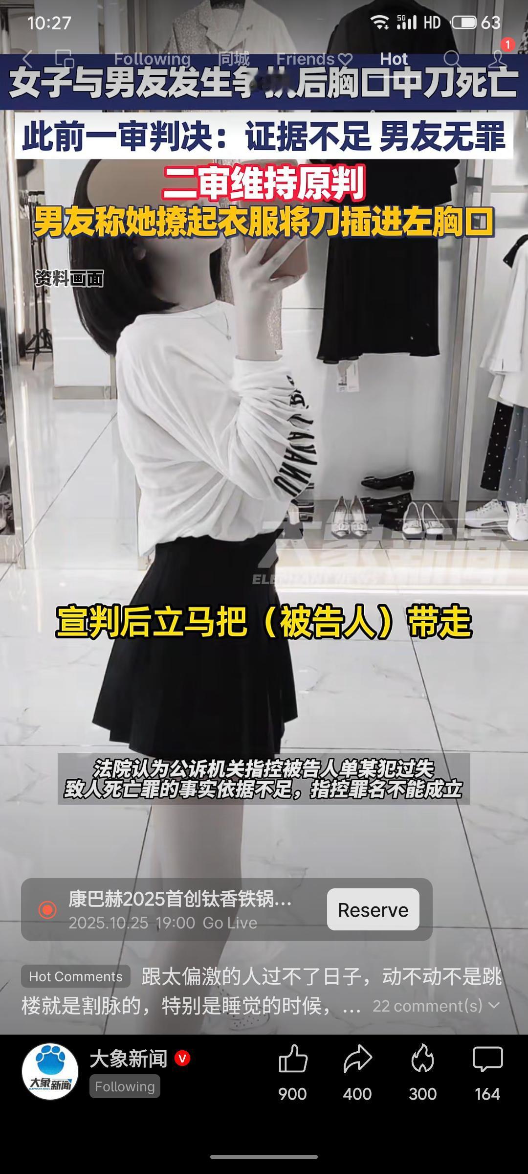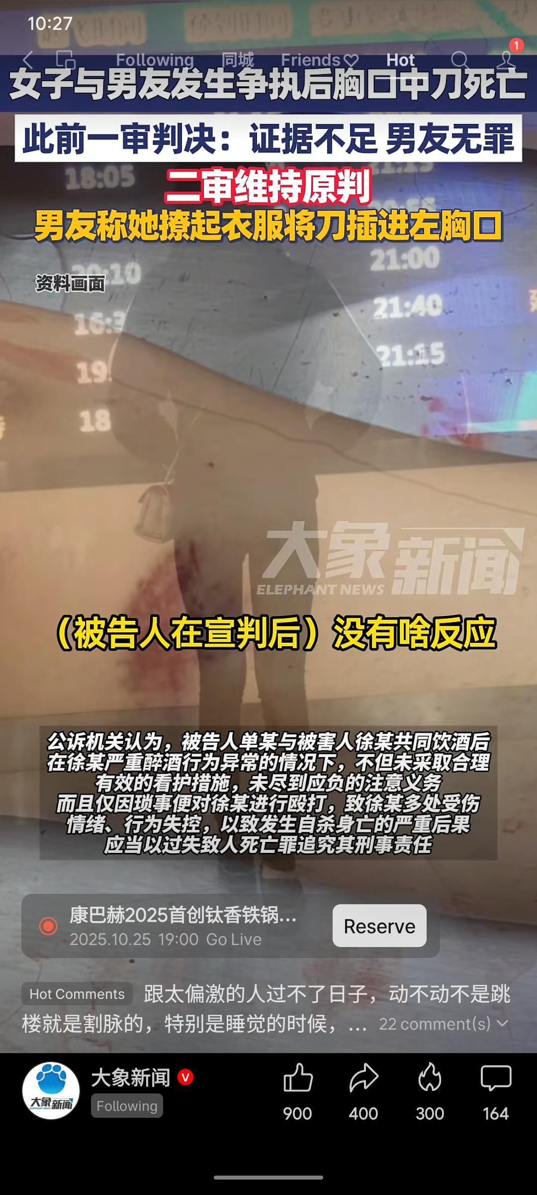 辽宁大连22岁女子徐某与男友单某因争执引发冲突,期间徐某情绪失控,持刀刺中自己胸部后身亡。法院审理认为,指控单某过失致人死亡罪证据不足,一审、二审均判决其无罪。家属表示将继续申诉。