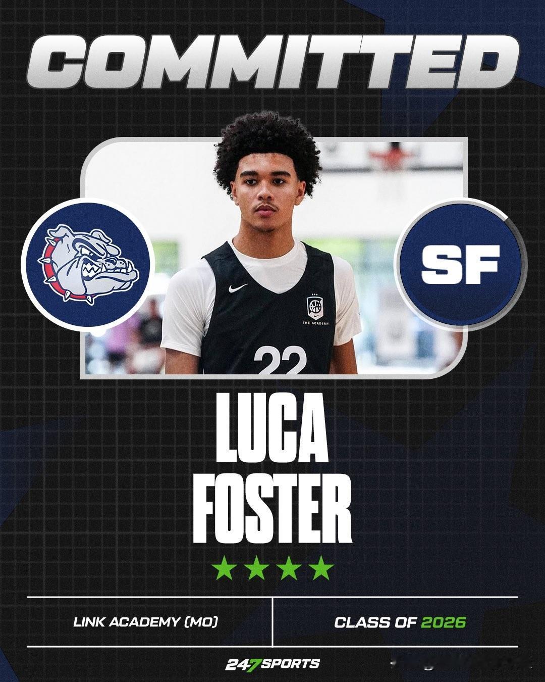 四星小前锋Luca Foster宣布承诺NCAA男篮 冈萨加大学,身高6-5=196,来自宾州,高四赛季转学至密苏里州Link Academy,选择这里是因为我有机会为一位伟大的教练效力,并发展成为一位NBA球员,球队这届收到的第三位加盟者,之前还有内线Sam Funches与德国控卫Jack Kaylil。