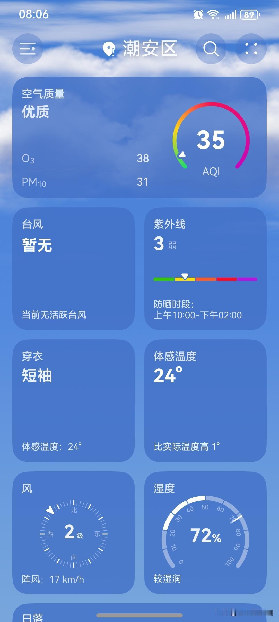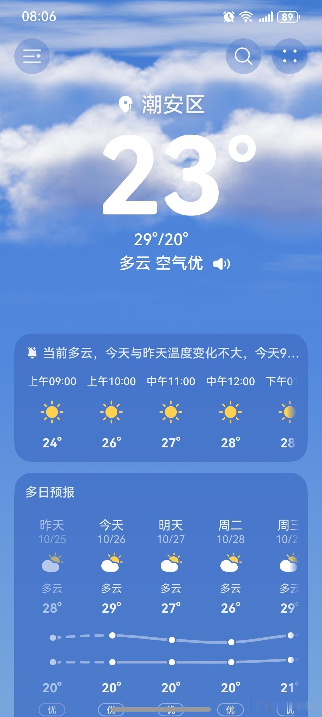 广东喜提“晴朗干燥+早晚清凉”好天气! 26~27日, 粤东市县多云间阴天, 其余大部市县多云间晴; 28日,雷州半岛南部多云转小雨, 其余大部市县多云间晴天。 今天(26日), 潮州多云, 气温20~29℃, 此刻气温23℃。 早上外面还是很凉爽的, 短袖短裤又点扛不住。 但到中午气温又会开始上升, 下午开始闷热感来袭, 突然又热了…… 这个季节啊! 乱穿衣纯属正常现象。 最好的穿搭就是: 早晚——秋装,白天——夏装! 今天的天气, 还是值得五星好评的! 如此天气! 元芳,你怎么看?