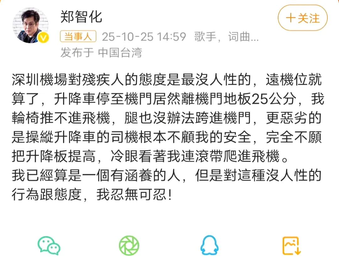 郑智化机场跌倒,回应之外更需行动! 那个唱着“风雨中这点痛算什么”的郑智化,近日却在深圳机场因地面湿滑重重摔倒,场景令人揪心。机场方虽已迅速致歉并承诺改进,但公众的关切远未平息。大家追问:为何湿滑隐患未能提前清除?无障碍服务能否真正落到实处? 一句“对不起”是开始,但杜绝类似事件,更需要的是扎扎实实的行动。希望下一次,所有人,尤其是行动不便者,都能真正安全、有尊严地出行。深圳机场回应郑智化连滚带爬进飞机 郑智化出场费 郑智化发文吐槽深圳机场你怎么看