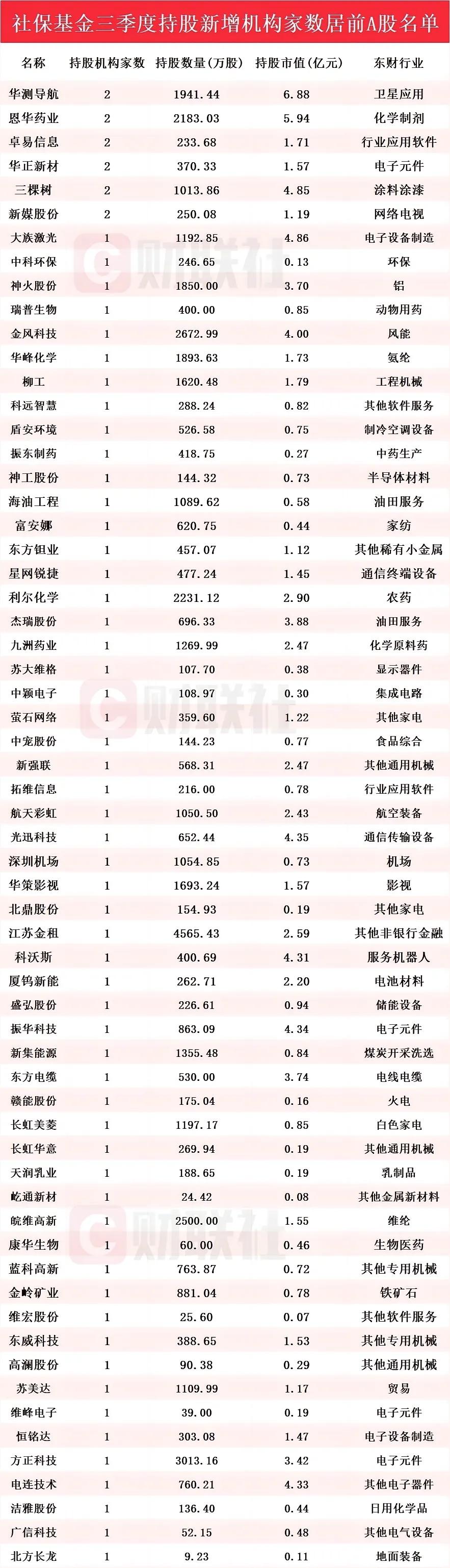 社保基金三季度持股新增机构家数居前的A股名单。内容包括: 1. 股票名称及持股机构家数: - 华测导航:2家 - 恩华药业:2家 - 鱼跃医疗:2家 - 卓胜微:2家 - 三棵树:2家 2. 持股数量及市值: - 华测导航:1941.44万股,6.88亿元 - 恩华药业:2183.03万股,5.94亿元 - 鱼跃医疗:233.68万股,1.71亿元 - 卓胜微:370.33万股,1.57亿元 - 三棵树:1013.86万股,4.85亿元 3. 行业分类: - 卫星应用、化学制药、医疗器械、电子元件、涂料涂装等。 这份名单反映了社保基金在三季度对某些A股的增持情况,显示出对这些公司的信心。