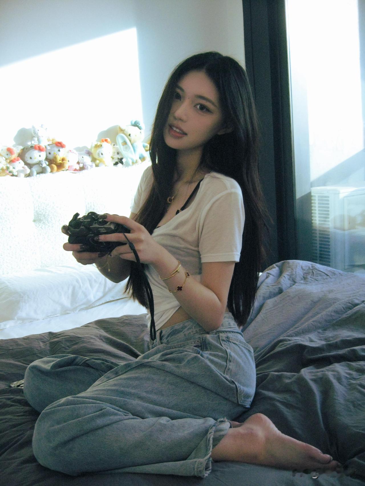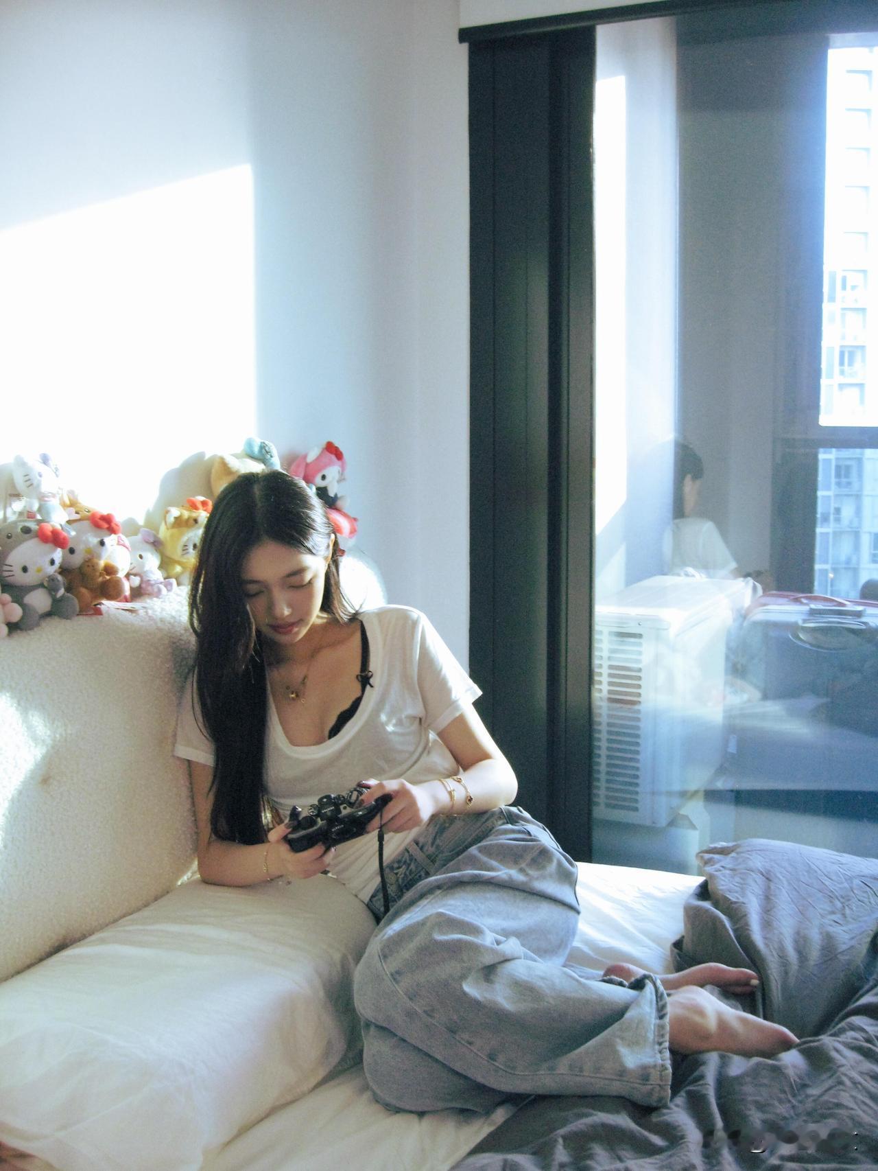 阳光洒进房间,少女坐在床上,慵懒而美好。