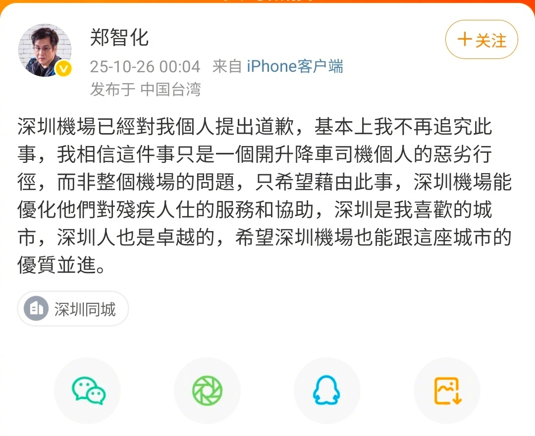 深圳机场已经对我个人提出道歉,基本上我不再追究此事,我相信这件事只是一个开升降车司机个人的恶劣行径,而非整个机场的问题,只希望借由此事,深圳机场能优化他们对残疾人士的服务和协助,深圳是我喜欢的城市,深圳人也是卓越的,希望深圳机场也能跟这座城市的优质并进。#郑智化[超话]# (大皖新闻记者 曹庆 殷志强)