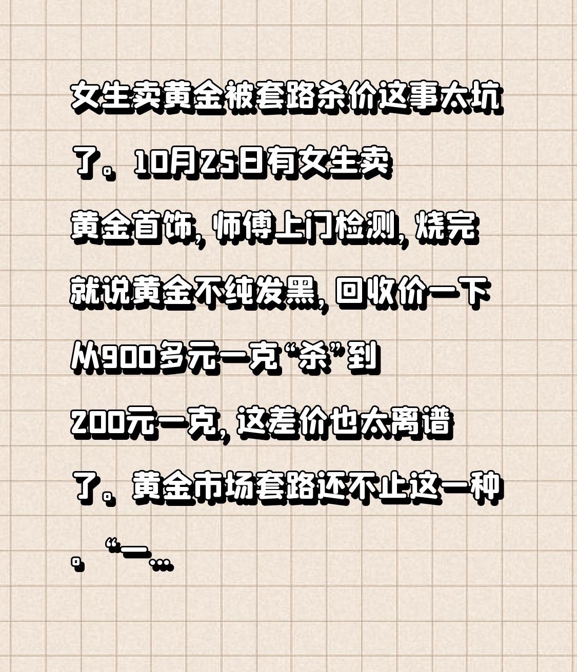 女生卖黄金被套路杀价这事太坑了。10月25日有女生卖黄金首饰,师傅上门检测,烧完就说黄金不纯发黑,回收价一下从900多元一克“杀”到200元一克,这差价也太离谱了。 黄金市场套路还不止这一种。“一口价金饰”也是坑,有店家故意隐瞒克重诱导消费。像顾女士置换足金戒指,店员不主动告知是一口价,还不称重,最后算下来戒指折合1297元/g。消费者买黄金可得擦亮眼睛,别被不良商家坑了。