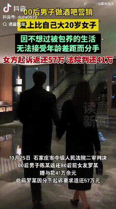 57万姐弟恋转账起风波,法院判决一出来,网友都炸了。 有个00后的酒吧男营销,工作的时候跟一位80后女士谈上恋爱了。后来男方发现这女的比自己大20岁,跟刚认识说的不一样,小伙儿立马就提分手了。小伙儿说:“这不是我想要的爱情,不想过被包养的生活。” 结果女的直接把小伙告到法院,要求他返还恋爱期间转的57万多块钱,说是“以结婚为目的”送的。 最近二审判决出来了,法院认定像1314元、520元这种特殊金额,属于情侣间正常送的,不用还。但其他41万多块,得全退回去。 好多网友吐槽:“别退啊,男的青春就不值钱啦?”也有人觉得,没结成婚,大额转账退回去也在理。 其实感情里要是掺和太多钱,事儿就容易扯不清。要是一开始就奔着结婚去,最好双方把经济往来说清楚。要是纯粹你情我愿送的,那就别事后再翻旧账。 这事你们咋看?欢迎留言讨论。 来源:读嘉新闻 2025-10-25