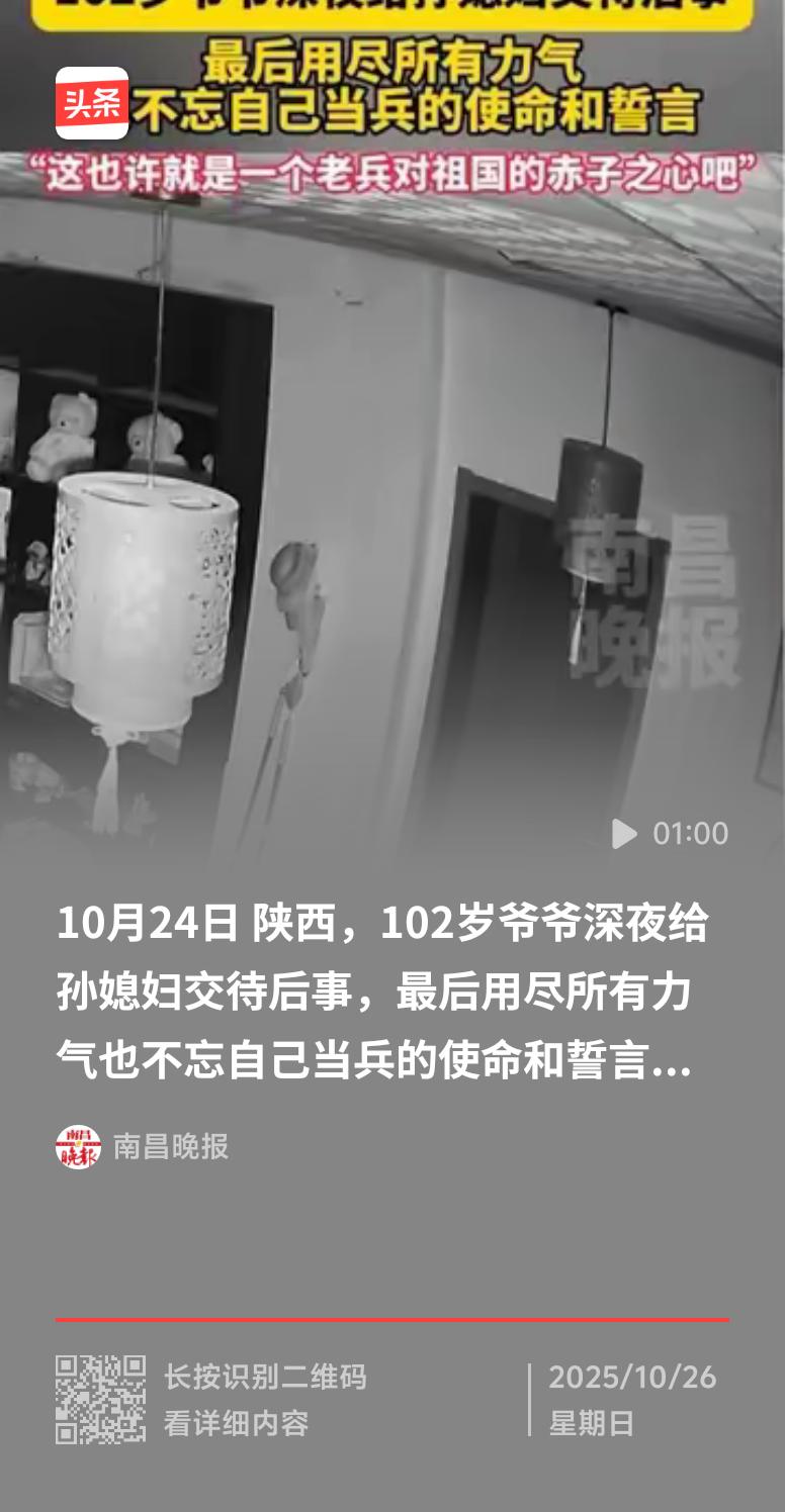 最近看到两则 102 岁爷爷深夜给后辈交待后事的故事,太让人动容了。 江苏宿迁的抗战老兵刘世安,凌晨敲响孙媳妇的门,留下锈迹斑斑的铁盒和泛黄红纸。铁盒里是存了 42 年、每月 200 元的存折,是要给孙媳妇办婚礼的钱,还有 70 年前的阵亡通知书副本和三等功奖章。爷爷在睡梦中离世,手里还攥着没填日期的请柬。 陕西农村的 102 岁老兵爷爷,深夜坐着轮椅找儿媳。他想回村和老伴合葬,想给长女留房子,还惦记给女儿讨回公道。他拿出装着军功章和“光荣之家”牌匾的铁盒,只为看一眼补办的军人优待证。 这些爷爷们用一生书写故事,他们的深情与执着,值得永远铭记。 临终老人